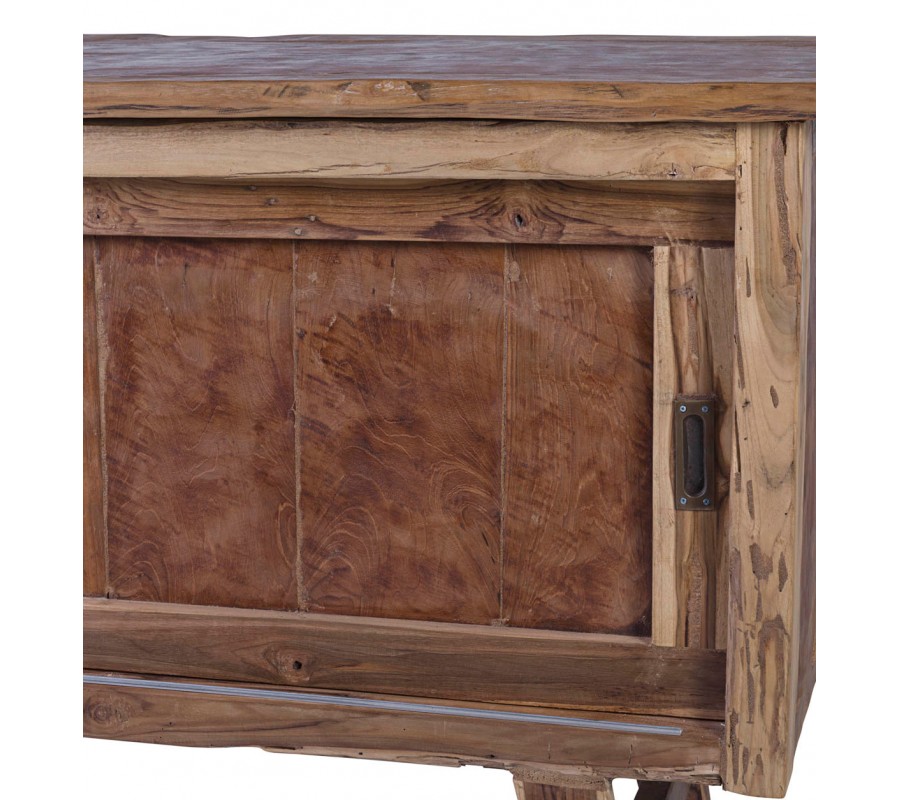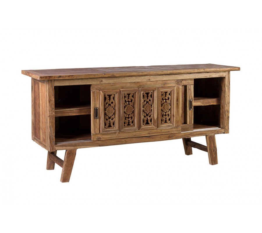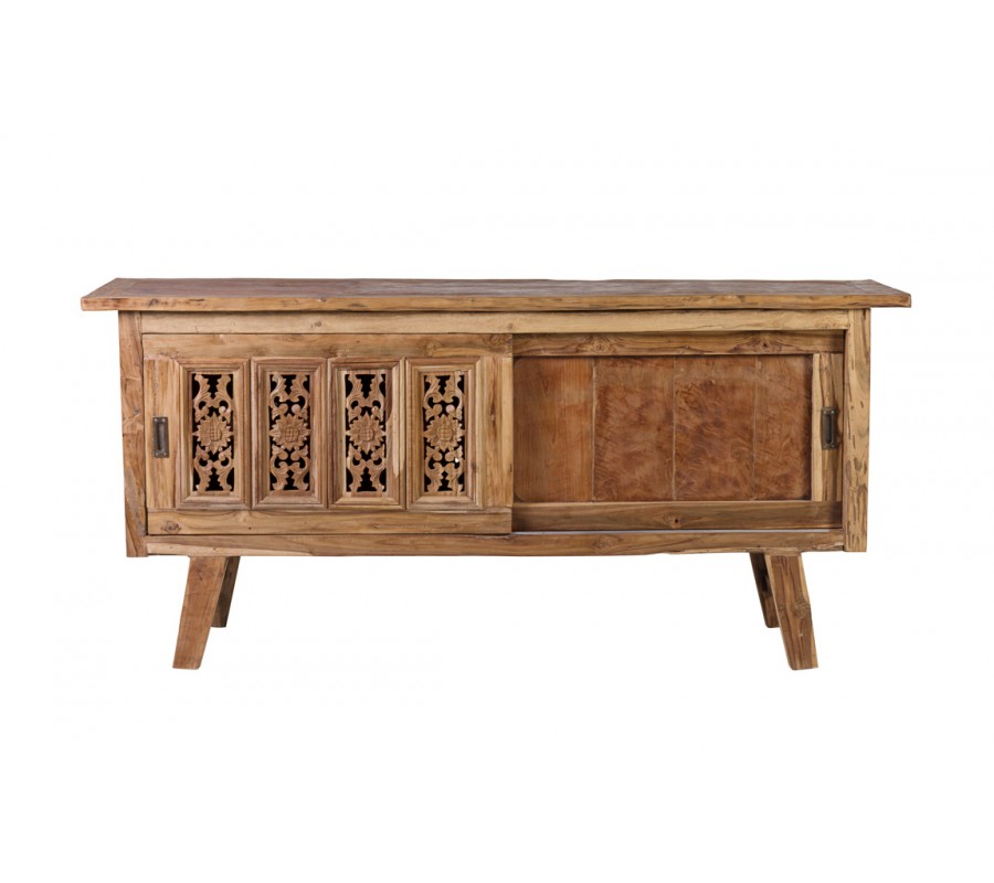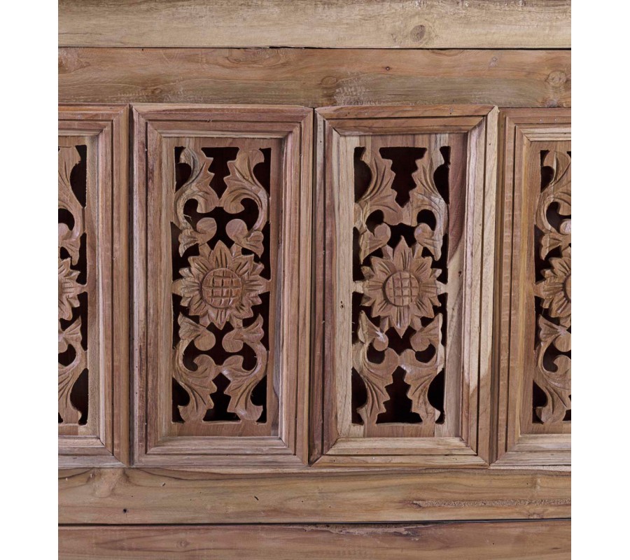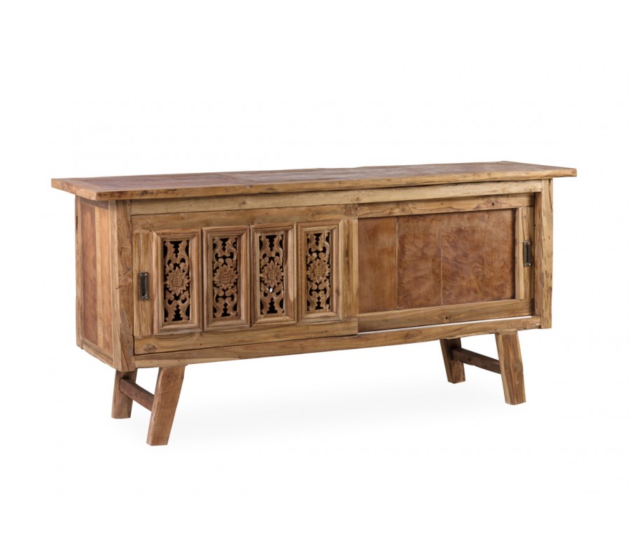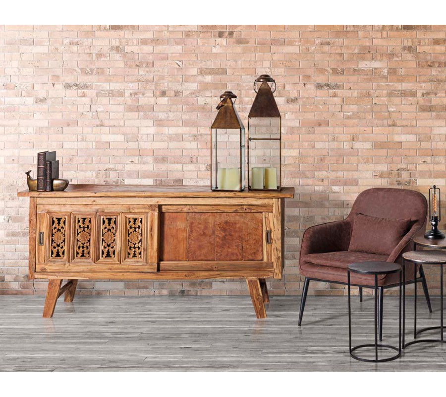 Dizajnový príborník Talia s koloniálnou konštrukciou a exoticky pôsobiacou štruktúrou dreva je skvelým základným kameňom, na ktorom môžete stavať zariadenie vašej obývačky, jedálne či pracovne presne podľa cestovateľských snov! Konštrukcia obdĺžnikového tvaru je postavená na šikmých nožičkách štýlovo vzájomne spájaných, ktoré sú zároveň prísľubou stability a pevnosti komody. Príborník disponuje dvomi protichodne posúvateľnými dvierkami s vklinenými úchytmi v etno štýle. Spirituálnosť a unikátnosť príborníka Talia umocňujú ručne vyrezávané ornamenty vo forme štyroch rámcov dekorovaných kvetovou výzdobou. Okrem praktického úložného priestoru, ktorý ocení každý spotrebiteľ, sa Talia stane klenotom celej miestnosti a zažiari v spoločnosti mohutných koloniálnych doplnkov, ratanových či hnedých kožených kresiel s nostalgickým nádychom exotiky.