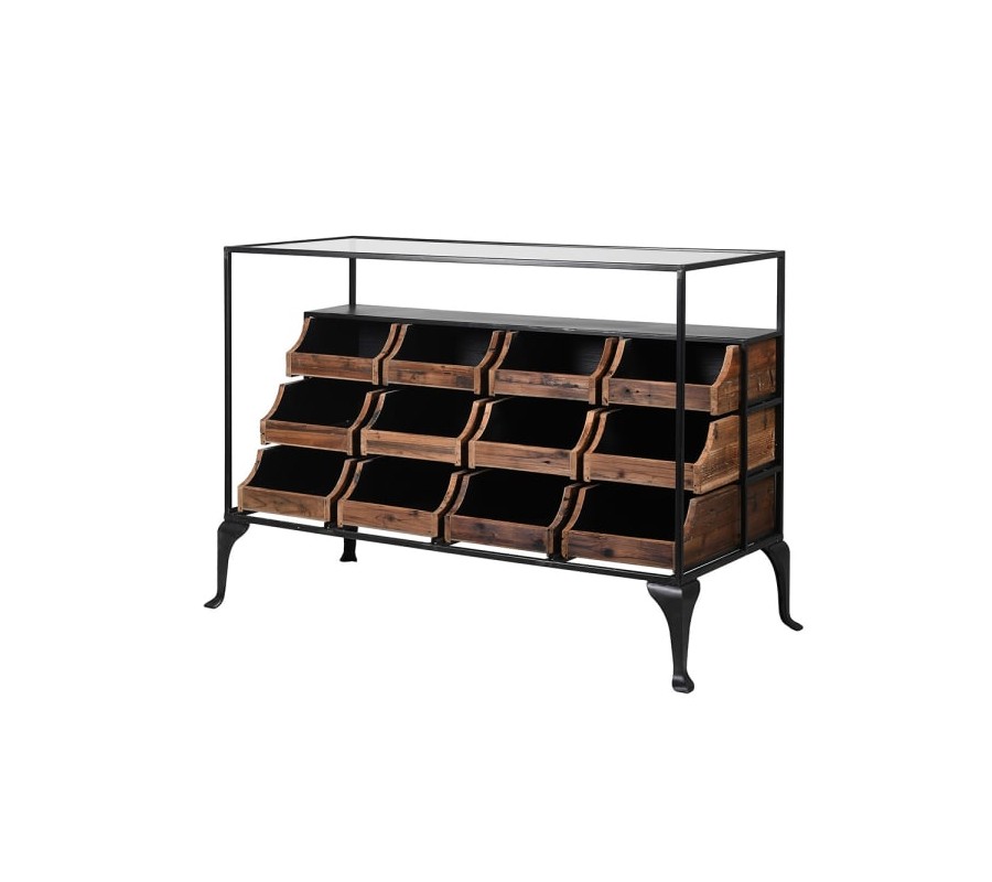 Exkluzívna komoda Ameda zaujme svojím jedinečným dizajnom. Tento kúsok má vďaka svojmu nevšednému dizajnu všestranné využitie. Svoje miesto si nájde v pracovni či v obývačke, rovnako ako aj v spálni. Kovový rám v čiernej farbe dopĺňa telo z masívneho dreva, ktoré tvorí dvanásť zásuviek. Zaujímavosťou je dizajn zásuviek- z jednej strany nájdete klasické zásuvky s kovovými úchytmi, no z druhej strany sú otvorené a vytvárajú zaujímavý vzhľad, vďaka čomu je možné túto komodu umiestniť aj do priestoru. Celkový dizajn dotvárajú zaoblené elegantné kovové nožičky a sklenená povrchová doska, ktorú možno využiť na vystavenie kvetov či dekorácií. Komodu Ameda odporúčame kombinovať s ďalším masívnym nábytkom, rovnako ako aj s kovovými doplnkami v industriálnom štýle.