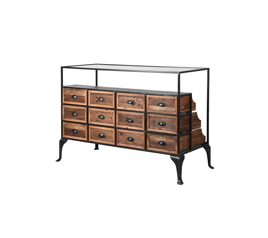 Industriálna masívna komoda Ameda hnedej farby s čiernou konštrukciou s dvanástimi zásuvkami 142cm