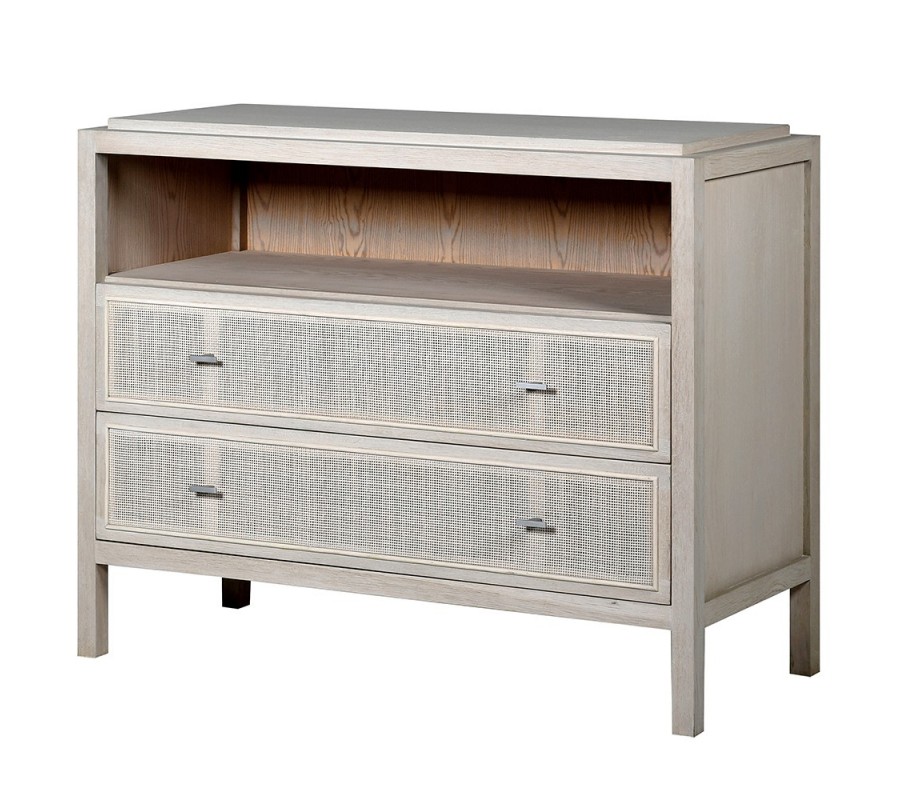 Luxusná provensálska komoda Sazerto z masívneho dubového dreva v sivej farbe s dvoma ratanovými zásuvkami a poličkou 120cm