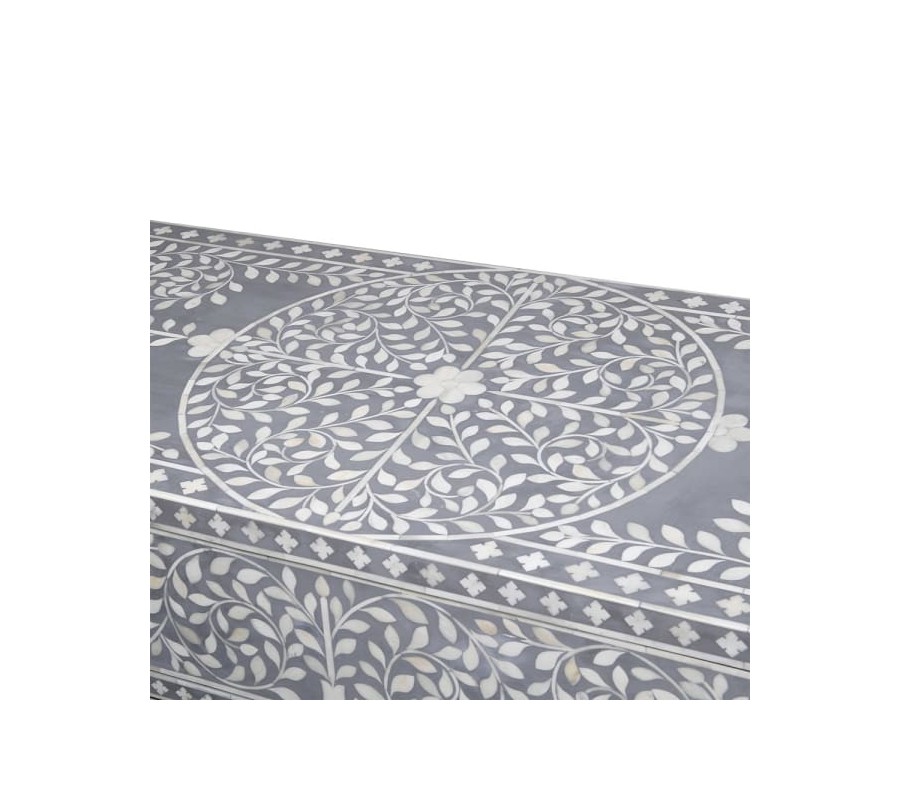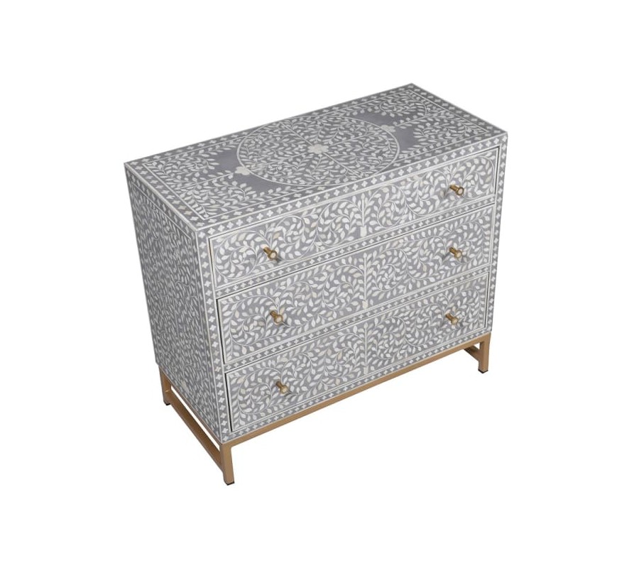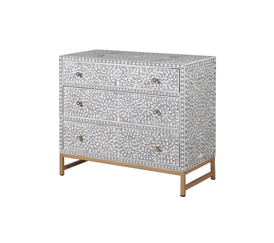 Unikátna komoda Daytona v štýle art deco vás prenesie do luxusných noblesných víl z minulého storočia. Vo svojom dizajne prepája kvalitný materiál s inovatívnou technikou a luxusným vzhľadom, čím vzniká jedinečný kúsok, ktorý môže obohatiť aj vaše priestory spálne, obývačky či pracovne. Komoda je vyrobená z dreva a disponuje tromi priestrannými zásuvkami. Svetlosivú povrchovú pravu celého tela zdobí jemný naturálny dekor bielej farby, ktorý je tvorený technikou bone inlay. Ide o techniku intarzie využívajúcu materiál ťavej kosti a živice, čím vzniká jedinečný efektný dizajn s hladkým povrchom. Celkový art deco vzhľad dopĺňa zlatá kovová podstava a nožičky. Komoda Daytona vynikne v kombinácii s čalúnenou sedačkou či kreslom, nábytkom s kovovými prvkami a bohatými doplnkami s dôrazom na zlatú farbu.