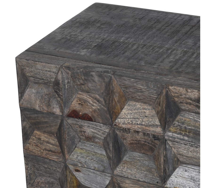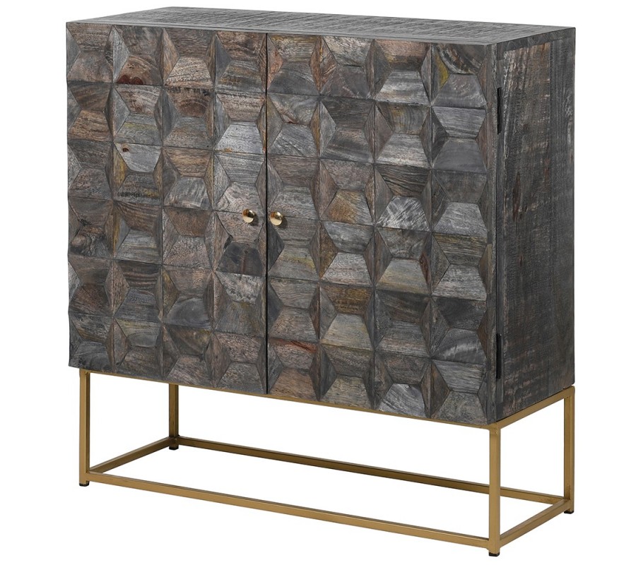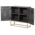Masívna skriňa z kolekcie art-deco štýlového nábytku Relia Vás zaujme svojím kvalitným vyhotovením z mangového dreva. Mohutné prevedenie skriňe Relia je dosiahnuté vďaka spomenutému masívnemu drevu mango, ktoré je obohatené o naturálny vzhľad s viditeľným zošúchaním na povrchu, čo vytvára jemný vzhľad podobný vintage štýlu. Tmavo sivé masívne drevo skriňe Relia je doplnené tenkou kovovou podstavou v zlatej farbe, čo vytvorí vzhľad v štýle art-deco, ideálny na kombináciu s nábytkom so zlatými prvkami. Dizajnové prevedenie skriňe Relia taktiež ponúka vyrezávanie, podobné diamantovému štvorcovému vzoru na páre dvierok, ktoré chránia vnútorný úložný priestor s dvoma poličkami. Tmavé prevedenie skriňe Relia krásne vynikne v tmavo zariadených interiéroch v kombinácií s nábytkom z kolekcie Relia a so zlatými stolnými lampami, ktoré umocnia luxusný vzhľad skriňe Relia.