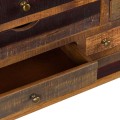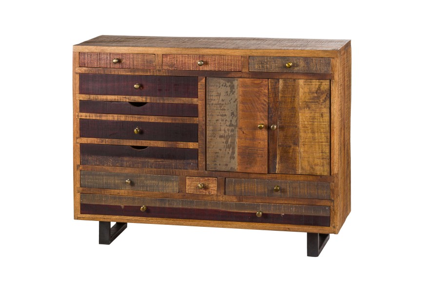 Industriálna masívna hnedá komoda Jeffry na dvoch nožičkách s rôznymi zásuvkami a mosadznými úchytmi 120cm