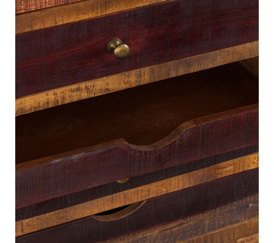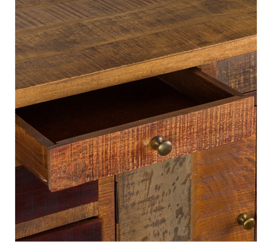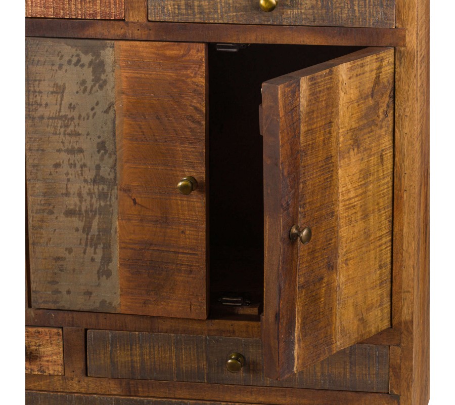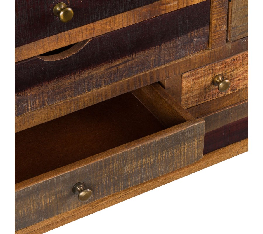 Unikátny kúsok v podobe mosívnej industriálnej komody Jeffry na nožičkách si zaslúži stať sa hlavným hrdinom vášho industriálne ladeného interiéru, Na prvý pohľad zaujme unikátna ručne vyrábaná drevená konštrukcia s množstvom menších i väčších zásuviek, a tiež úložného priestoru uzavretého dvierkami. Povrch konštrukcie nesie známky jemného ryhovania, pri čom každý kus je originál. Industriálna komoda pôsobí harmonicky vďaka farebnej kombinácii odtieňov hnedej- snúbia sa na nej všetky odtiene od mahagónovej až po svetlú škoricovú hnedú. Zásuvky disponujú krásnymi okrúhlymi mosadznými úchytmi, ktoré dodávajú komode dávku nostalgie a v neposlednom rade poslúžia ako praktický dizajnový doplnok celkového vzhľadu. Výborne sa bude hodiť do jedální, obývačiek, vstupných hál či spální. Komoda Jeffry vynikne v industriálnych či minimalistických priestoroch. V kombinácii s masívnym konferenčným stolíkom v mahagónových hnedých tónoch spolu s koženým kreslom v čokoládovej hnedej vytvoria dokonalú oázu pokoja.