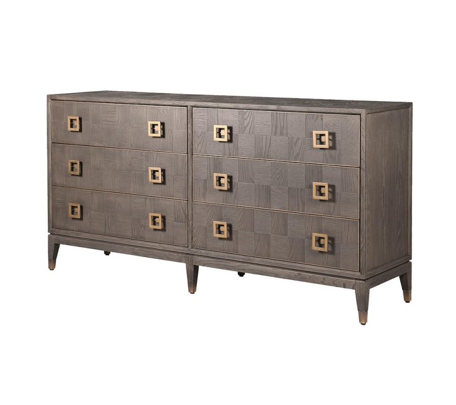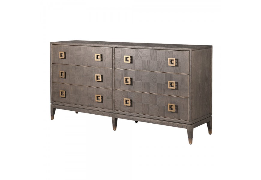 Art deco dizajnová komoda Quadria Gris z masívneho dubového dreva sivohnedej farby so šiestimi zásuvkami 180cm