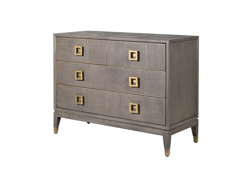 Masívna komoda Quadria Gris sa nesie v modernom štýle, ktorý prepája s art-deco prvkami Vyznačuje sa najmä svojimi elegantnými čistými líniami a jednoduchými geometrickými tvarmi, vďaka čomu vzniká pútavý nadčasový dizajn vhodný na zariadenie domácností, hotelov či firemných priestorov. Komoda je vyrobená z kvalitného masívneho dubového dreva s povrchovou úpravou sivohnedej farby a vďaka jeho zvýraznenej prirodzenej kresbe získava príjemný naturálny nádych. Povrch je zároveň obohatený o zaujímavý štvorcový vzor tvorený precíznym ukladaním jednotlivých kúskov dreva s rôznymi smermi letokruhov. Komoda Quadria Gris poskytuje úložný priestor v podobe dvoch väčších a dvoch menších zásuviek vhodných na praktickú organizáciu vášho šatstva, dokumentov či rôznych iných predmetov, ktoré sa rozhodnete v komode uskladniť. Zásuvky dopĺňajú elegantné kovové úchyty zlatej farby, ktoré vytvárajú štýlový štvorcový tvar a dodávajú komode nádych štýlu art-deco. K úchytom tiež ladia jemné zlaté prvky na spodnej časti nožičiek. Elegantný dizajn komody Quadria Gris vhodne doplní moderne spálne, pracovne či obývačky, kde ju možno kombinovať s ďalším masívnym nábytkom, doplnkami z kovu a výraznými farebnými dekoráciami. Skvelou voľbou sú taktiež doplnky zo skla, ktoré vo vašich priestoroch umocnia nádych art deco štýlu. Pre dokonalé zjednotenie priestoru a vytvorenie unikátneho moderného efektu odporúčame tiež kombináciu aj s ďalšími kúskami z kolekcie Quadria Gris.