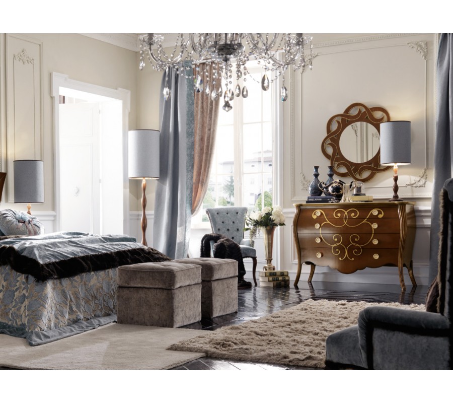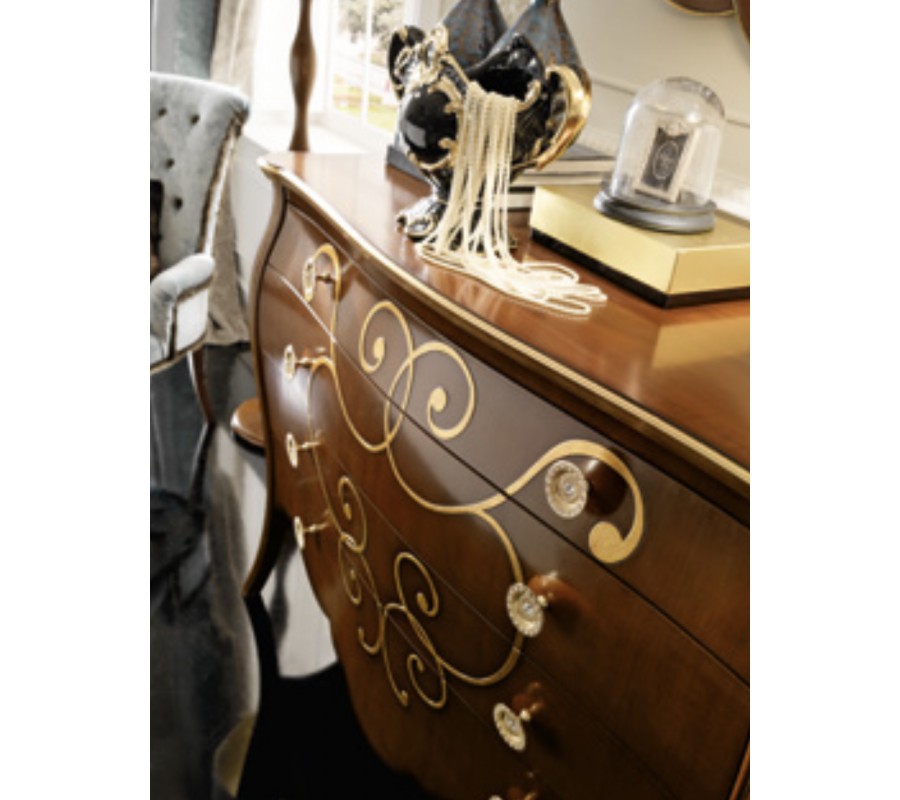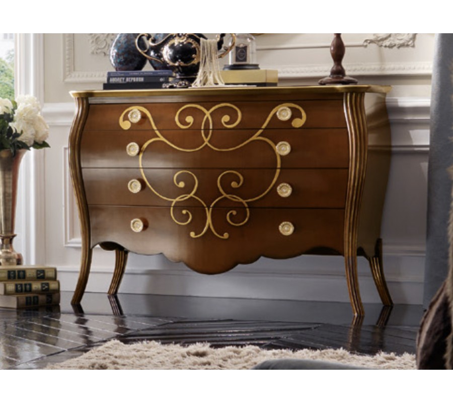 Luxusná komoda Benin vás očarí svojím exkluzívnym dizajnom, ktorý spája klasickú eleganciu s prvkami rustikálneho a barokového štýlu. Už na prvý pohľad vás upúta jej nádherné vyrezávané zdobenie a jemne zaoblené tvary. Komoda Benin je vyrobená z kvalitného masívneho dreva, ktoré zabezpečuje kvalitu, dlhú životnosť a zároveň komode dodáva unikátny luxusný vzhľad. Farebné prevedenie si môžete zvoliť spomedzi viacerých ponúkaných odtieňov, čo umožňuje doladiť komodu presne podľa vašich potrieb. Okrem unikátneho a estetického prevedenia ponúka komoda Benin aj bohatý úložný priestor v podobe štyroch zásuviek s okrúhlymi úchytmi. Ozdobné vyrezávanie na zásuvkách je zvýraznené pomocou patiny, čo vytvára historizujúci a starožitný nádych. Podľa zvoleného prevedenie môže byť ornamentálne zdobenie na zásuvkách zvýraznené zlatou farbou. Okrem zaoblených hrán, vkusne vyrezávaných elegantných nožičiek a ornamentálneho zdobenia zásuviek sa komoda pýši prekrásnym vlnovkovým vykrojením spodných hrán. Toto unikátne zdobenie k vám domov vnesie nádych klasického štýlu typický pre luxusné historické vily. Komoda Benin krásne vynikne v kombinácii s ďalšími rovnomennými kúskami či iným masívnym nábytkom v podobnom štýle. Svoje miesto si nájde v luxusne ladených spálňach, pracovniach či obývačkách, a možno ju doplniť o dekorácie či doplnky v podobe stolnej lampičky s textilným tienidlom, zlatej kovovej vázy či dreveného nástenného zrkadla.