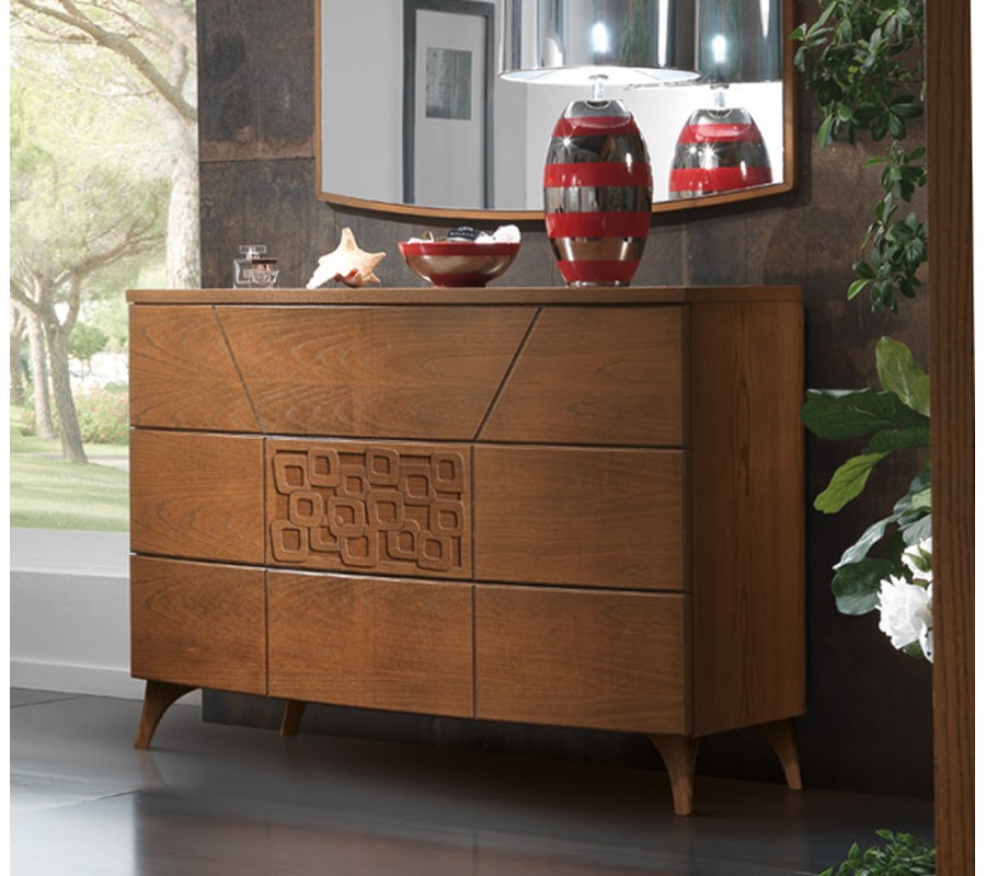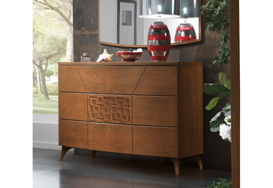 Originálny a masívny dizajn komody Varietty garantuje okrem najvyššej kvality aj nadčasového pomocníka do vašej spálne. Komoda z masívu v modernom talianskom prevedení stojí na štyroch mierne šikmých nožičkách, ktoré zabezpečujú dokonalú stabilitu a pevnosť konštrukcie. Farebnosť vyhotovenia sa nesie v teplých hnedých prírodných tónoch, pričom jemne preniká prirodzená kresba dreva. Komoda disponuje štedrým úložným priestorom v podobe troch samostatných nad sebou uložených zásuviek bez úchytov. Komoda Varietty z talianskej kolekcie nábytku vás osloví okrem kvality a nadčasovosti aj krásnym prepracovaným minimalistickým dizajnom s ručným vyrezávaním na čele strednej zásuvky, ktoré tvorí súbor štvorcov s oblými okrajmi vystupujúcich reliéfovito. Moderná komoda s retro nádychom sa bude výborne hodiť k manželskej posteli Varietty s rovnakým vyrezávaným reliéfom na čele, a tiež k nočnému stolíku Varietty. Širokú komodu Varietty je vhodné doladiť k svetlej hnedej podlahe, ľanovým závesom v slonovinovej farbe či k posteľnej bielizni v terakotovej farbe.