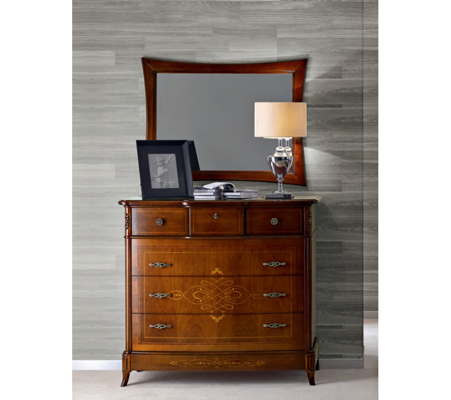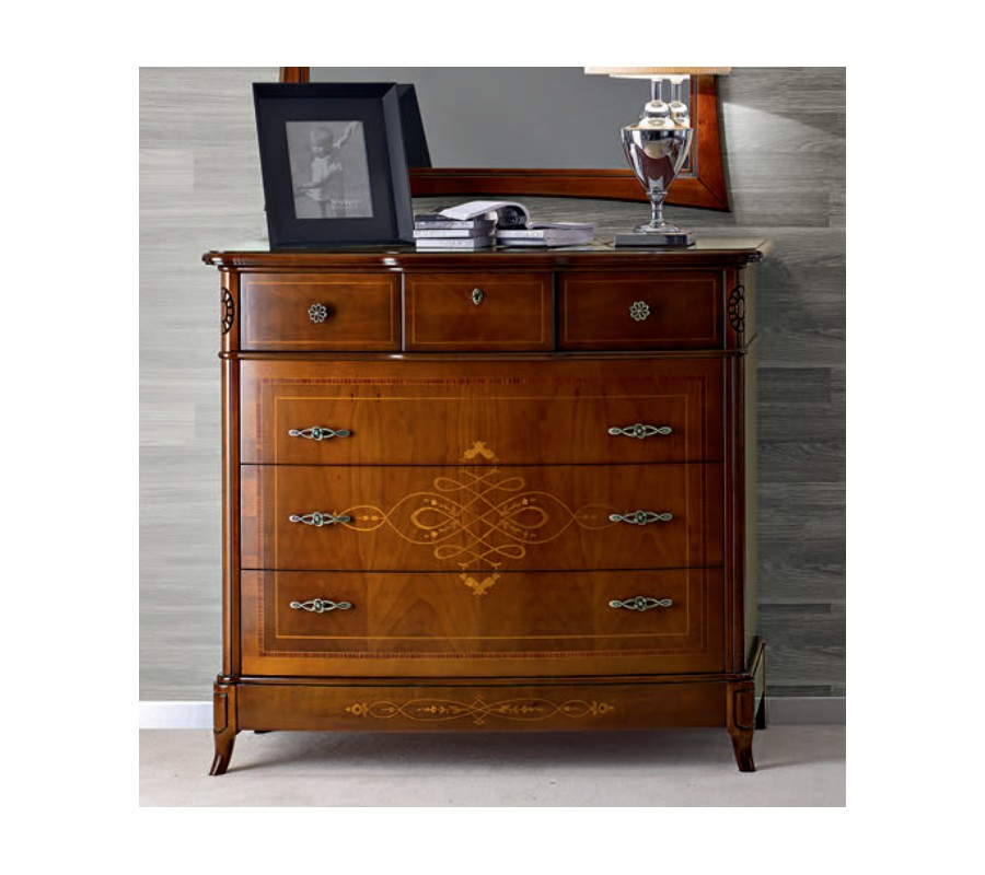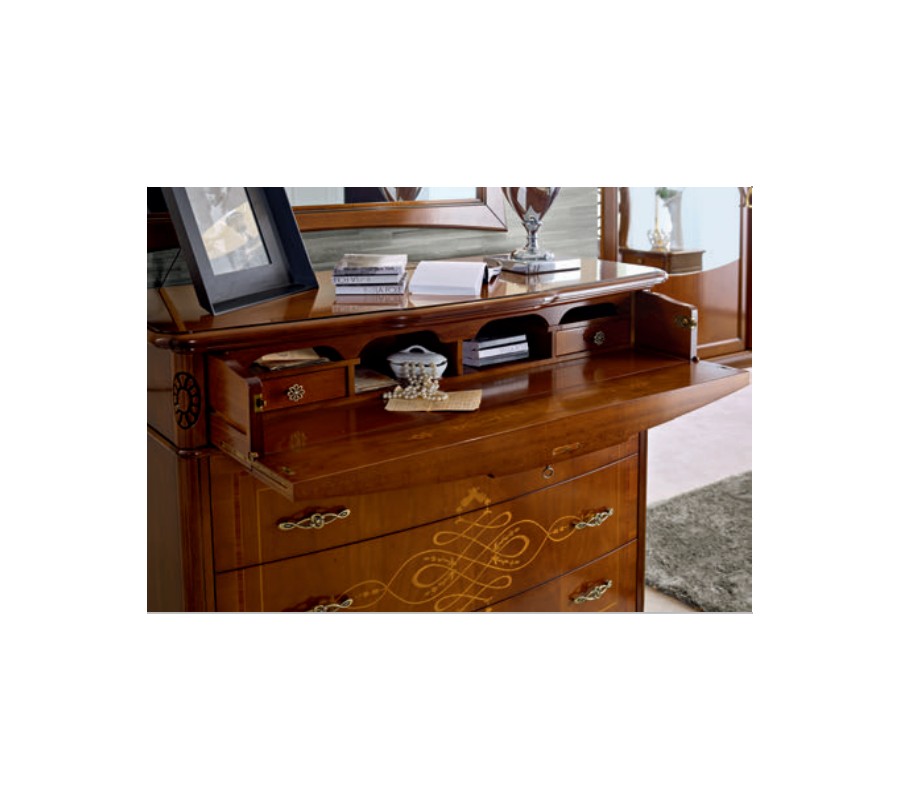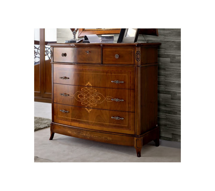 Pôvab a honosné detailné vyhotovenie klasickej komody Carpessio upúta nielen milovníkov klasického nábytku, ale aj každého náročného zákazníka. Pohľady upúta intarzia - výrazné zdobenie na strednej zásuvke siahajúce na vrchnú a spodnú zásuvku. Konštrukcia je vyrobená z dreveného masívu najvyššej kvality a je postavená na štyroch nožičkách ohnutých do vonkajšej strany. Nožičky nesú jemné oblé vyrezávanie aplikované rovnako v oblasti vrchnej dosky. Komoda Carpessio disponuje kreatívne riešeným úložným priestorom. Pozostáva z troch širokých zásuviek a vyklápacích dvierok na kľúčik v hornej časti komody. Zásuvky majú kovové úchyty abstaktného podlhovastého tvaru oživujúce celkový dizajn komody spolu s kvetinovými okrúhlymi úchytmi na dvierkach. Farbné prevedenie masívu si jednoducho zvolíte podľa vašich predstáv a preferencií na základe nižšie uvedeného vzorkovníka. Komoda Carpessio sa výborne hodí do klasických a rustikálnych spální a jej farebné variácie sa vynímajú v kombinácii s béžovou, slonovinovou a kapučínovou farbou na kobercoch či závesoch z ľanového materiálu s čipkou.