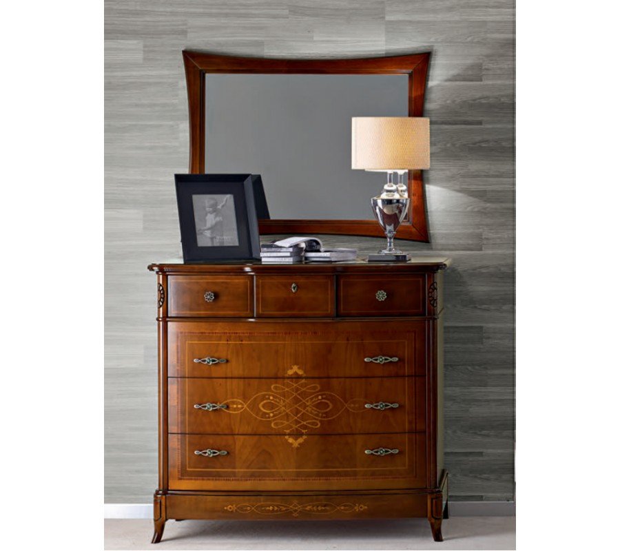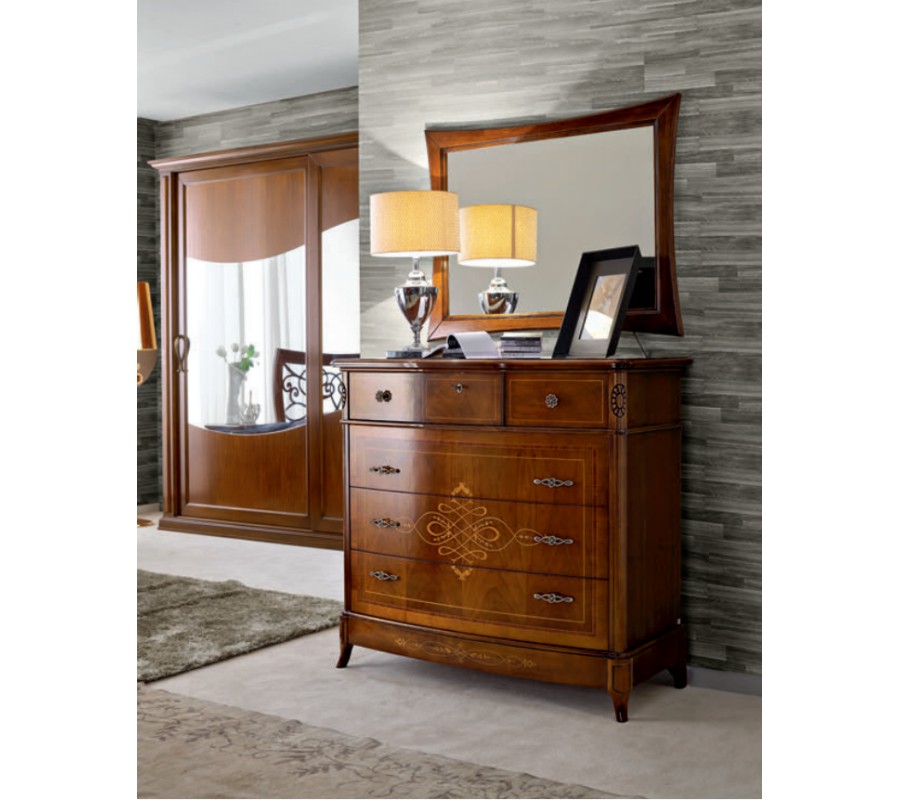 Pôvab a honosné detailné vyhotovenie klasickej komody Carpessio upúta nielen milovníkov klasického nábytku, ale aj každého náročného zákazníka. Pohľady upúta ornamentálne výrazné zdobenie na strednej zásuvke siahajúce na vrchnú a spodnú zásuvku. Konštrukcia je vyrobená z dreveného masívu najvyššej kvality a je postavená na štyroch nožičkách ohnutých do vonkajšej strany. Nožičky nesú jemné oblé vyrezávanie aplikované rovnako v oblasti vrchnej dosky. Komoda Carpessio disponuje kreatívne riešeným úložným priestorom. Pozostáva zo troch širokých zásuviek a jednej členenej zásuvky v hornej časti komody. Zásuvky majú kovové úchyty abstaktného podlhovastého a kvetového tvaru oživujúce celkový dizajn komody. Typ masívneho vyhotovenia si jednoducho zvolíte podľa vašich predstáv a preferencií. Komoda Carpessio sa výborne hodí do klasických a rustikálnych spální a jej farebnosť sa vyníma v kombinácii s béžovou, slonovinovou a kapučínovou farbou na kobercoch či závesoch z ľanového materiálu s čipkou.