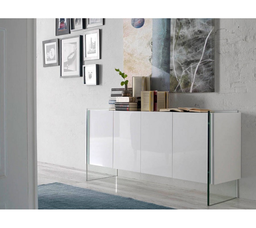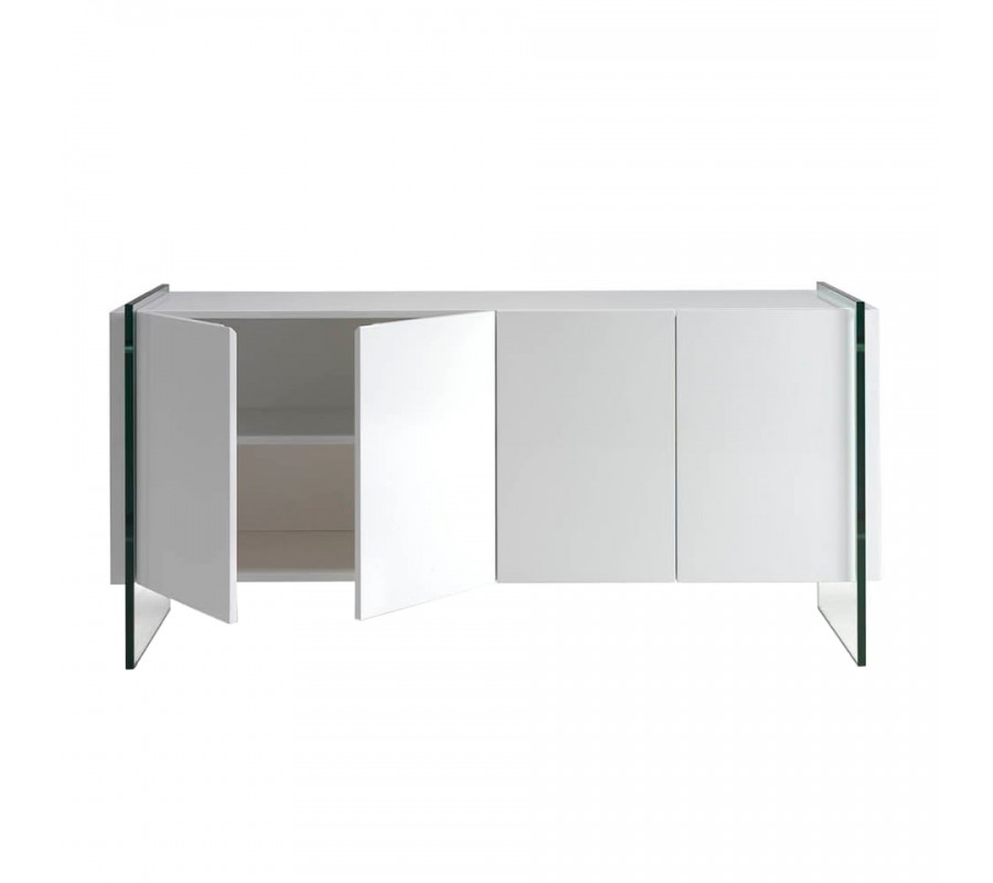 Luxusný moderný príborník Forma Moderna sa môže pochváliť konštrukciou z dreva, ktoré je ošetrené lesklým bielym lakom. Dominantným dizajnovým prvkom sú jeho originálne bočné nohy, vyrobené z 12mm hrubého tvrdeného skla, vďaka ktorým získate vo Vašom interiéri nielen pocit priestrannosti, ale taktiež aj nadčasového vzhľadu, elegancie a luxusu.