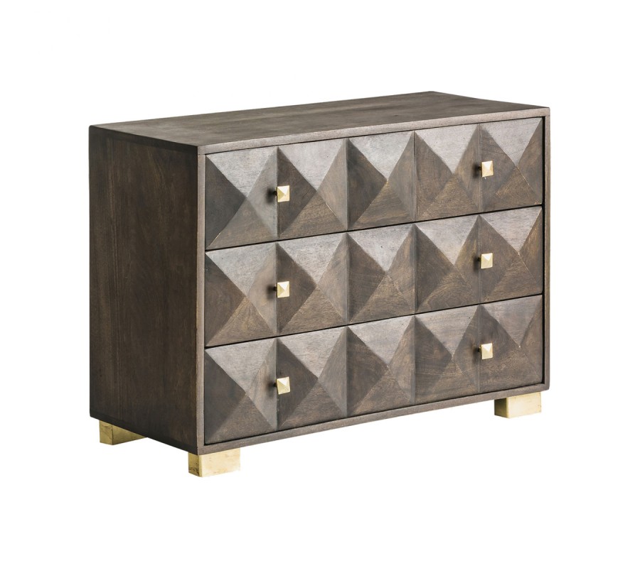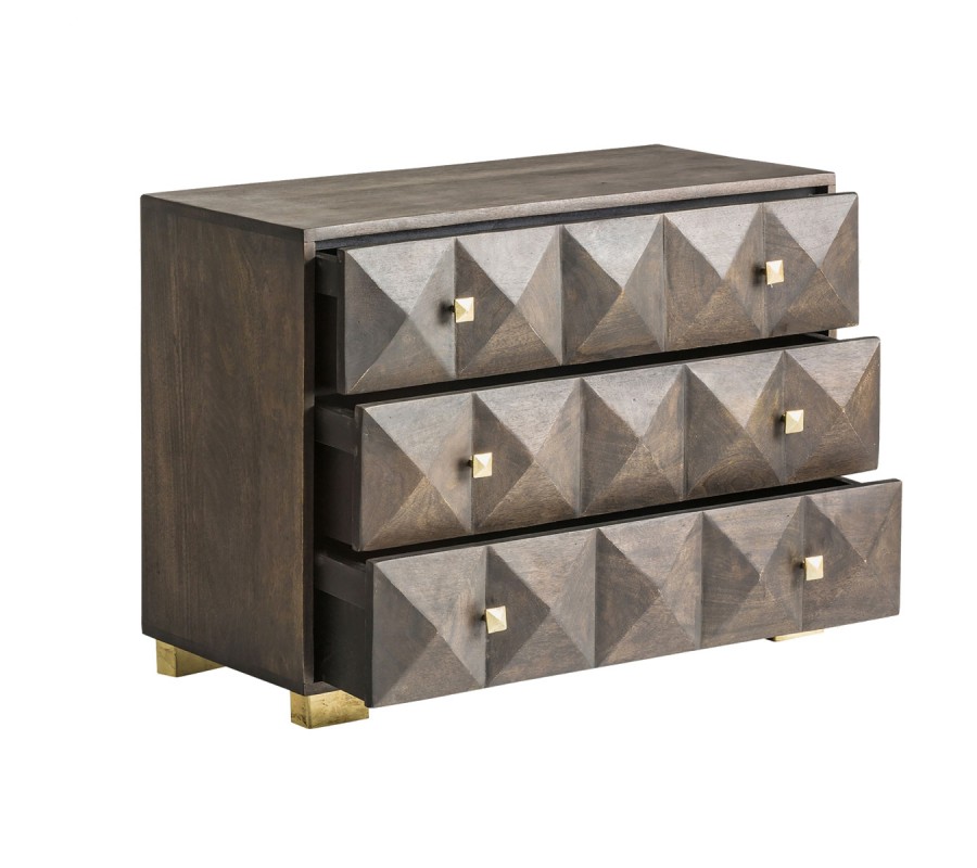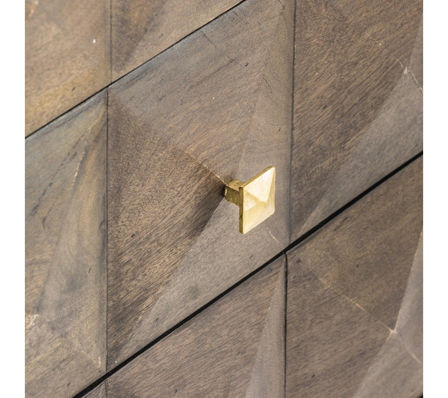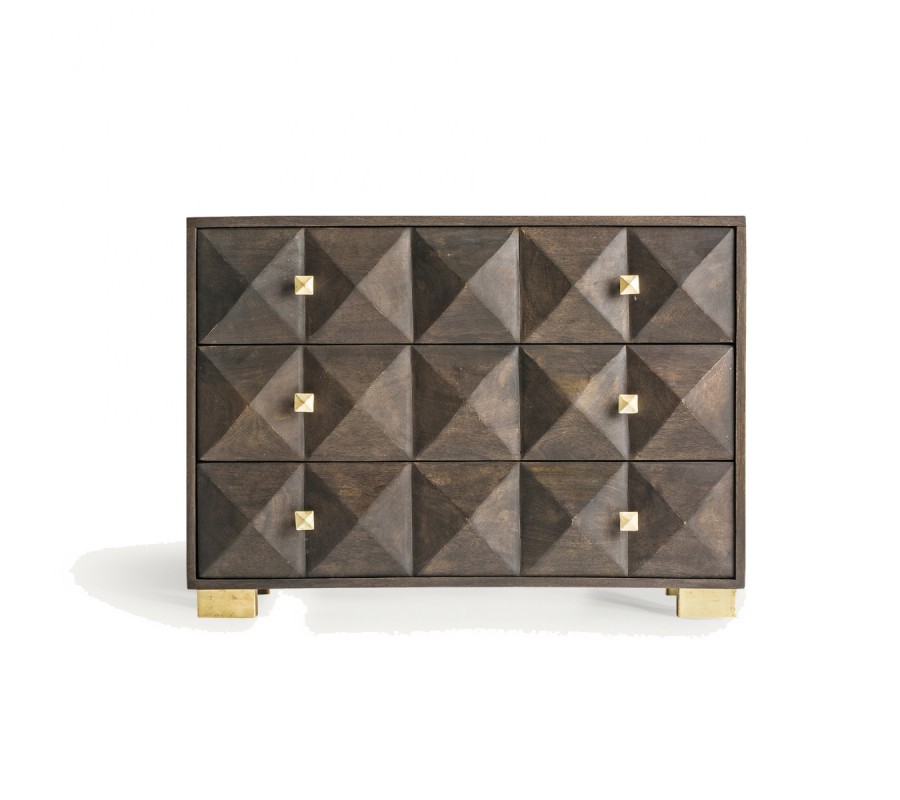 Jedinečná komoda Azzair zaujme svojím vzhľadom kombinujúcim štýl art deco s etno a orientálnymi prvkami. Komoda je vyrobená z kvalitného masívneho mangového dreva s tmavohnedou povrchovou úpravou. Poskytuje úložný priestor v podobe troch priestranných poličiek, ktorých predná strana je zdobená zaujímavým geometrickým reliéfom. Práve reliéfne členenie je dominantným prvkom celého dizajnu komody Azzair, vďaka ktorému zaujme už na prvý pohľad pri vstupe do miestnosti. Tmavohnedé drevené telo komody efektne dopĺňajú zlaté nožičky z kovu a zlaté rukoväte, ktoré umocňujú art deco vzhľad. Komoda Azzair teda zapadne predovšetkým do art deco, ale i orientálne či etno ladených priestorov spální, pracovní alebo hosťovských izieb. Doplnením o výrazné zamatové kreslo, zlaté doplnky v podobe stolnej či stojacej lampy alebo kovových nástenných poličiek si priestory krásne zútulníte a umocníte v nich efekt štýlu art deco!