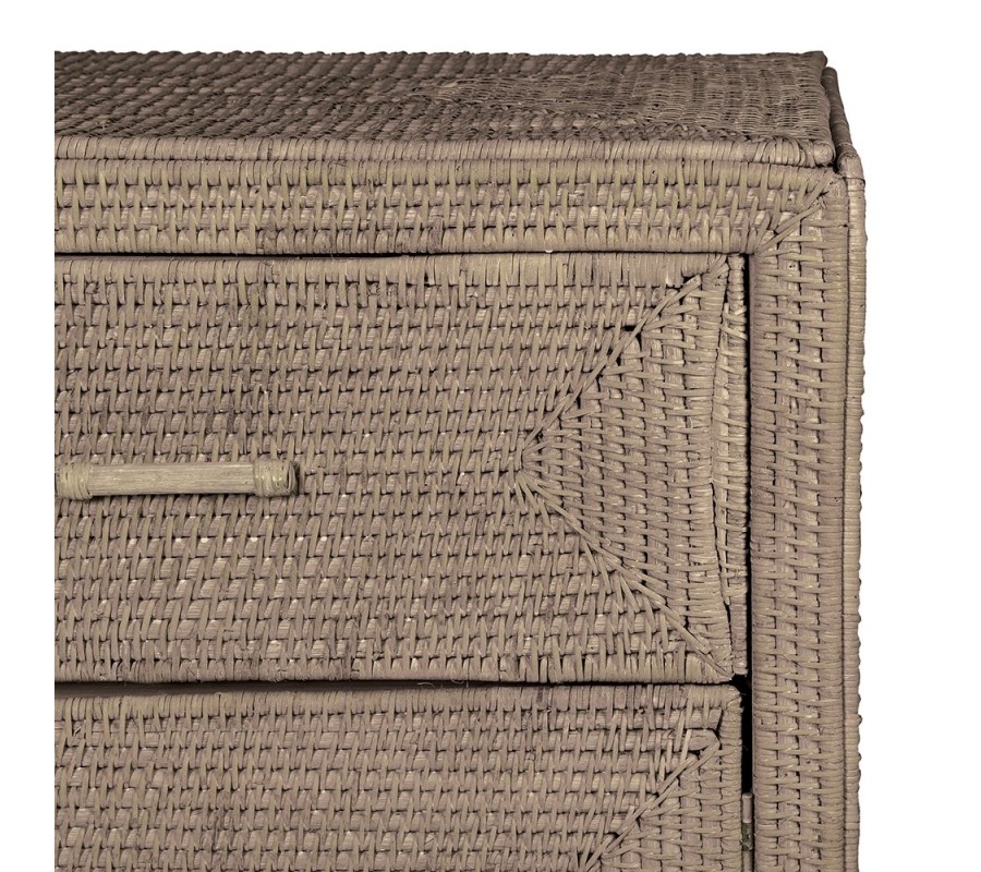 Luxusná komoda Ratana znie symfóniou prírodných materiálov. Je vyrobená z masívneho mahagónového dreva s dizajnovým dekoratívnym výpletom z ratanového vlákna. Úložný priestor je zložený z dvoch rovnako veľkých zásuviek vo vrchnej časti a dvoch rovnako veľkých skriniek pod nimi. Komoda je postavená na štyroch krátkych nožičkách. V naturalistickej tendencii sa nesú aj úchytky na otváranie zásuviek a dvierok. Prírodné drevo je upevnené k dvierka prostredníctvom pevného ratanového vlákna. Vzory na výplete komody zvýrazňujú diagonálne línie a dodávajú rovnému povrchu ilúziu hĺbky. Tento geometrický vzor sa prepája s jednoduchou lineárnou siluetou a nábytok tak nie je len funkčným úložným priestorom, ale aj oku lahodiacim dekoratívnym doplnkom. Komodu môžete umiestniť do obývačky alebo jedálne s ďalším ratanovým nábytkom. Skvelým doplnkom sú živé zelené rastliny, ktoré vám pomôžu skutočnú oázu pokoja. Exotické drevo sa hodí aj do priestorov zariadených v etno štýle.