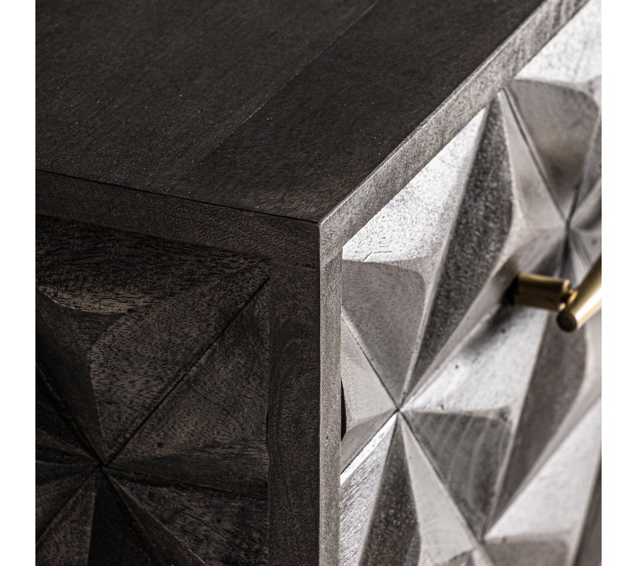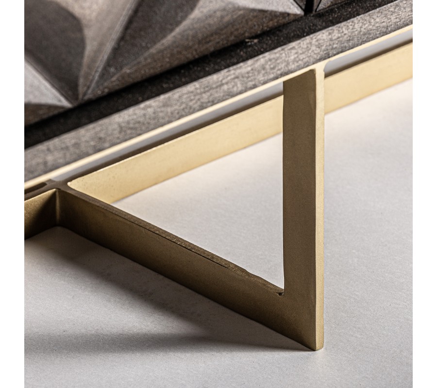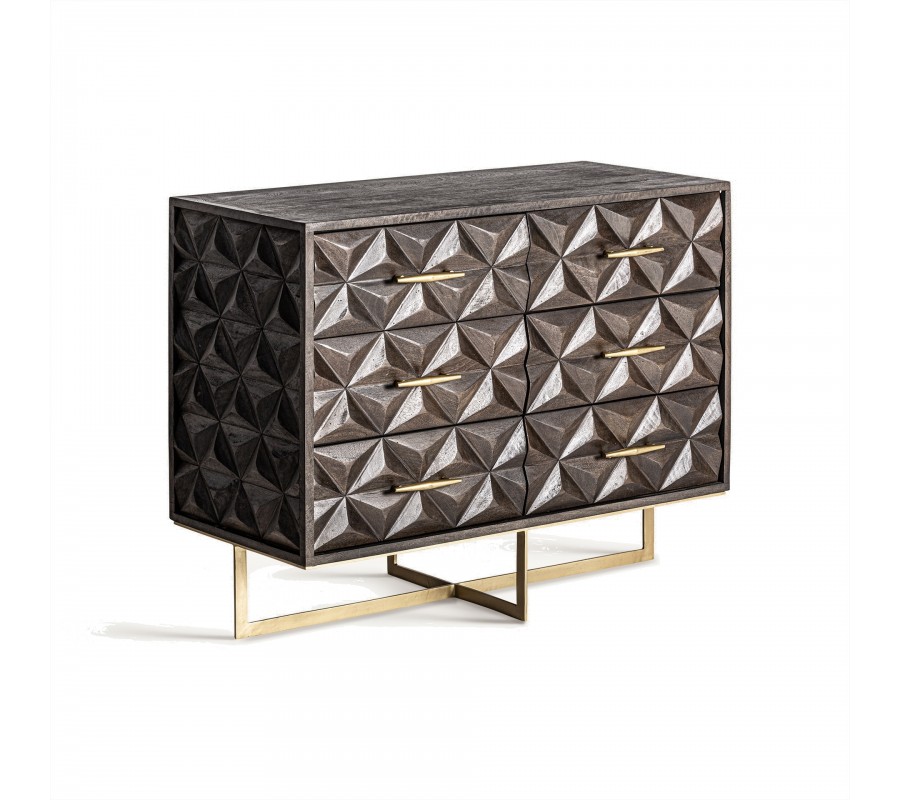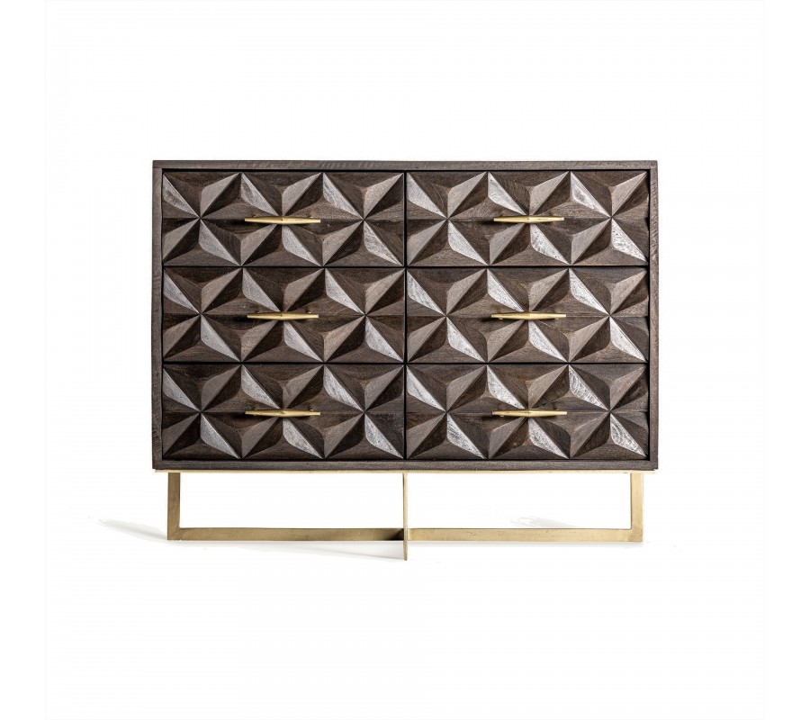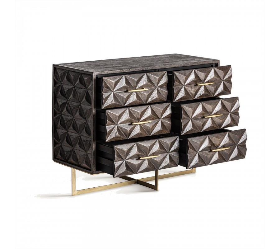 Komoda Oxalis je zhmotnením opulentnosti a majestnátnosti štýlu art-deco. Je vyrobená z masívneho mangového dreva v bohatej čokoládovej hnedej farbe, ktorá vytvára luxusný estetický kontrast s kovovými prvkami v zlatej farbe. Dizajnu dominuje bohaté reliéfne zdobenie na zásuvkách a bočných stranách komody. Plastický vzor je vyskladaný z trojuholníkov, čo podporuje art deco estetiku charakteristickú používaním geometrických tvarov. Reliéfne zdobenie tieý evokuje tvary brúsených diamantov, čo ešte zvýrazňuje luxusný charakter tohto nábytku. Pri pohľade z diaľky môže pripomínať vďaka lesklému povrchu a odrazom svetla na ňom aj florálne orientálne motívy, ktoré sú tiež často vyskladané z jednoduchých základných tvarov. Komoda bude vďaka svojmu zdobeniu výrazným moderným extravagantným prvkom s estetickou funkciou, ktorý vám zároveň poskytuje bohatý úložný priestor v šiestich zásuvkách. Každý kus je jedinečným ručne opracovaným originálom a jednotlivé výrobky sa z tohto dôvodu môžu mierne odlišovať, napríklad štruktúrou a kresbou dreva, čo ešte pridáva na jedinečnosti tohto nábytku. Komoda je skvelou voľbou do obývačky, spálne či jedálne v art deco štýle, kde ju môžete prepojisť so sedačkou, stolíkom či stoličkami so zlatými nožičkami. Vďaka lakovanému povrchu sa tiež hodí do priestorov zariadených v glamour štýle, kde ju môžete doplniť lesklými dekoráciami a doplnkami.