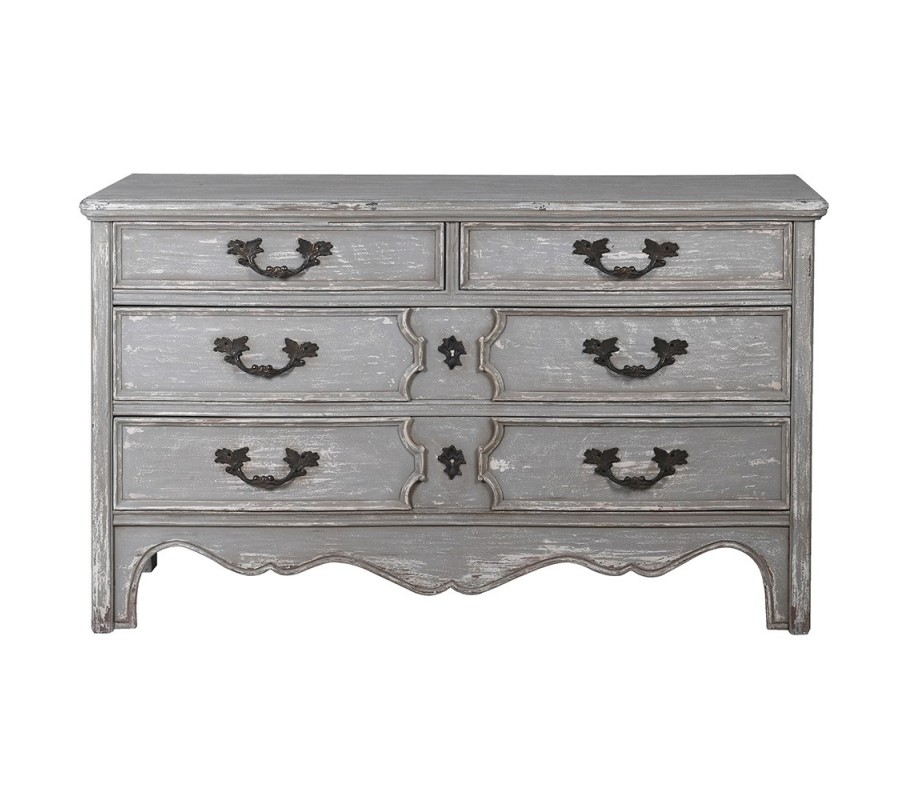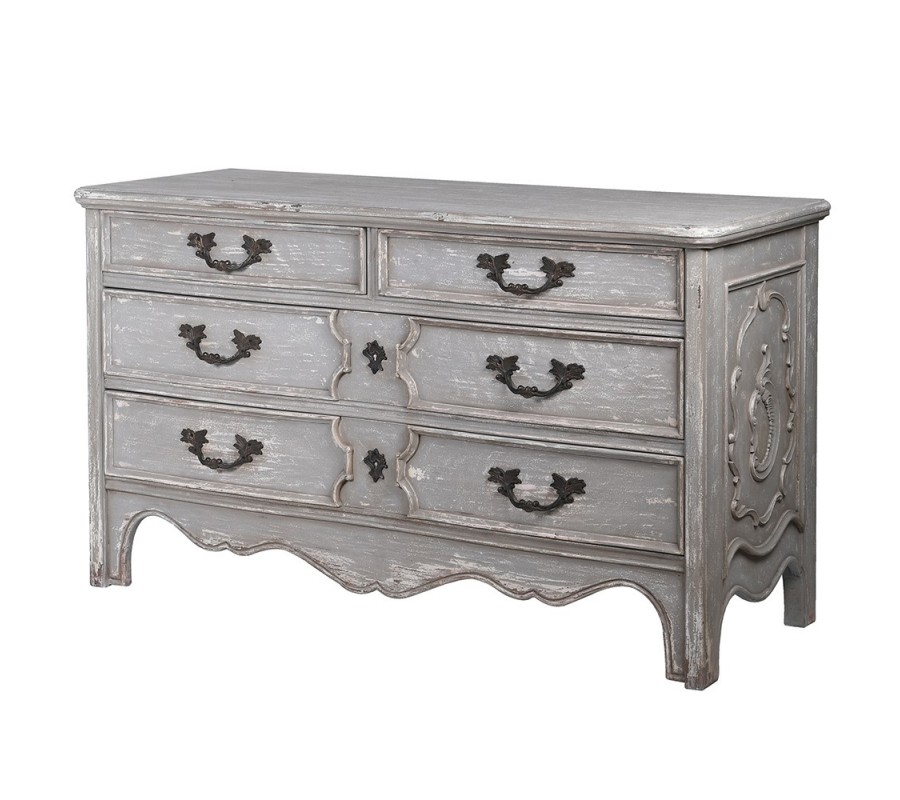 Opotrebovaný vzhľad tejto komody dodáva vintage nádych do vašej spálne. Vintage štýl je veľmi populárny a dokáže vytvoriť útulnú atmosféru plnú štýlu a charakteru. Komoda Lilina v sivej farbe s svojím klasickým vyrezávaním a opotrebovaným dizajnom bude iste vyniknúcim prvkom vašej spálne a prinesie do nej eleganciu a osobitý štýlový vzhľad.