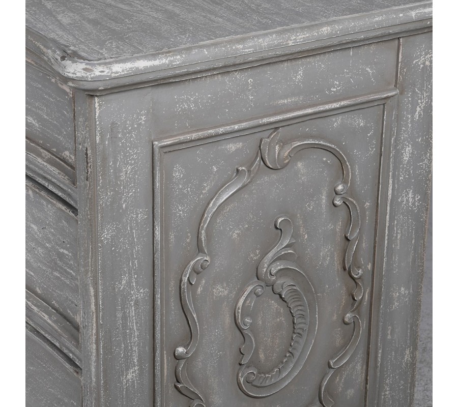 Luxusná vintage komoda Lilina v sivej farbe je skvelým a jedinečným doplnkom do vašej spálne, najmä ak ju skombinujete s ďalším nábytkom v rovnakom štýle. Táto komoda má jemné klasické vyrezávanie na bokoch, čo tvorí zaujímavé ornamenty a dodáva jej osobitý šarm.