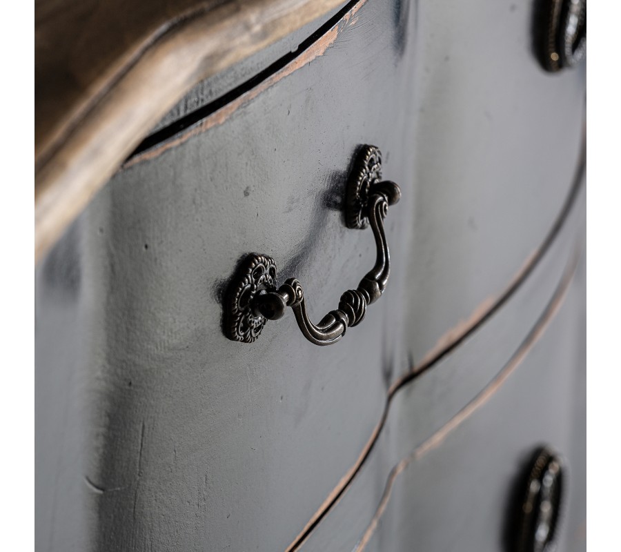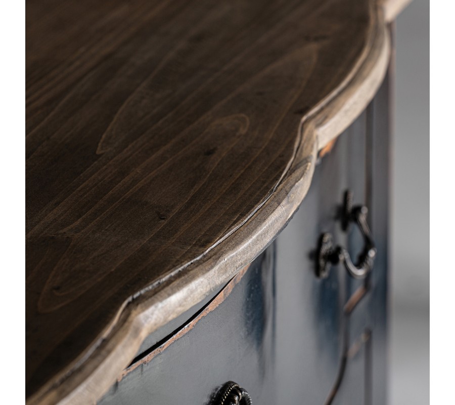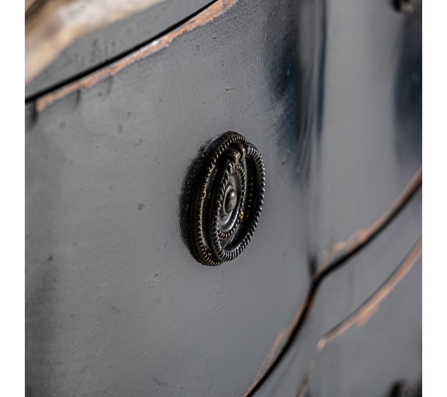 Luxusná komoda Zena Noir v sebe spája elegantnú klasickú siluetu a očarujúce vintage spracovanie. Dizajnu dominuje čierna farba so starožitným ošúchaným efektom, ktorý skvele dopĺňa vyrezávané dekorovanie. V zdobení prevládajú oblúkové tvary. Predná strana komody má symetricky zvlnený povrch, ktorý ju vizuálne rozdeľuje na tri vertikálne časti. V kombinácii s tromi úchytkami na každej zásuvke tak vzniká hravá ilúzia veľkého poštu zásuviek. Úchytky sú kovové s ornamentálnym zdobením, krajné majú poloblúkový visiaci tvar, zatiaľ čo tie v strede sú okrúhle. Tento detail je dôkazom dobre premysleného dizajnu a spojenia rozmanitých prvkov, ktoré súznejú v harmonickom vizuále. Vrchná doska má prírodnú svetlú hnedú farbu dreva, ktorá vytvára príjemný kontrast k čiernemu náteru a zároveň prináša naturálny prvok. Vďaka tomu komodu prepojíte s nábytkom z masívneho dreva vo vidieckom štýle. Do takto zariadeného priestoru vnesiete zaujímavý farebný akcent. Komodu tiež môžete umiestniť do spálne k posteli s rustikálnym alebo vyrezávaným čelom v tmavých farbách. V jedálni zastúpi funkciu príborníka a v kombinácii so zrkadlom vo vintage štýle bude pôsobiť šarmantným eklektickým dojmom. Môžete tiež pridať ďalší nábytok z kolekcie Zena Noir z našej ponuky.