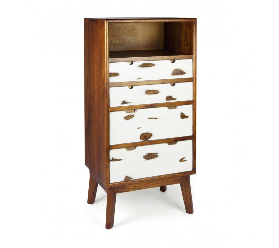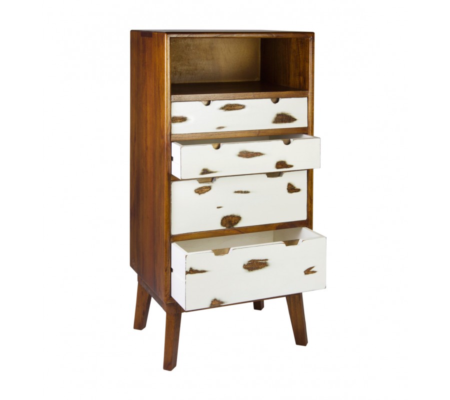 Severská vintage komoda Vellesa v hnedej farbe z masívneho mindi dreva so štyrmi bielymi zásuvkami a policou 125 cm