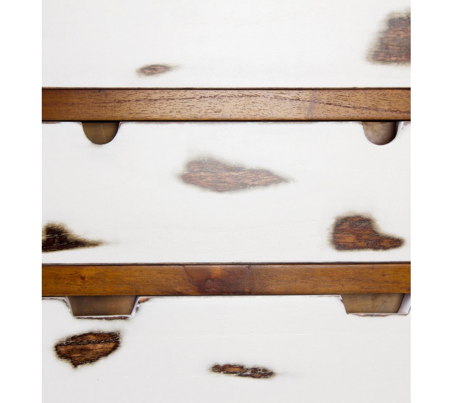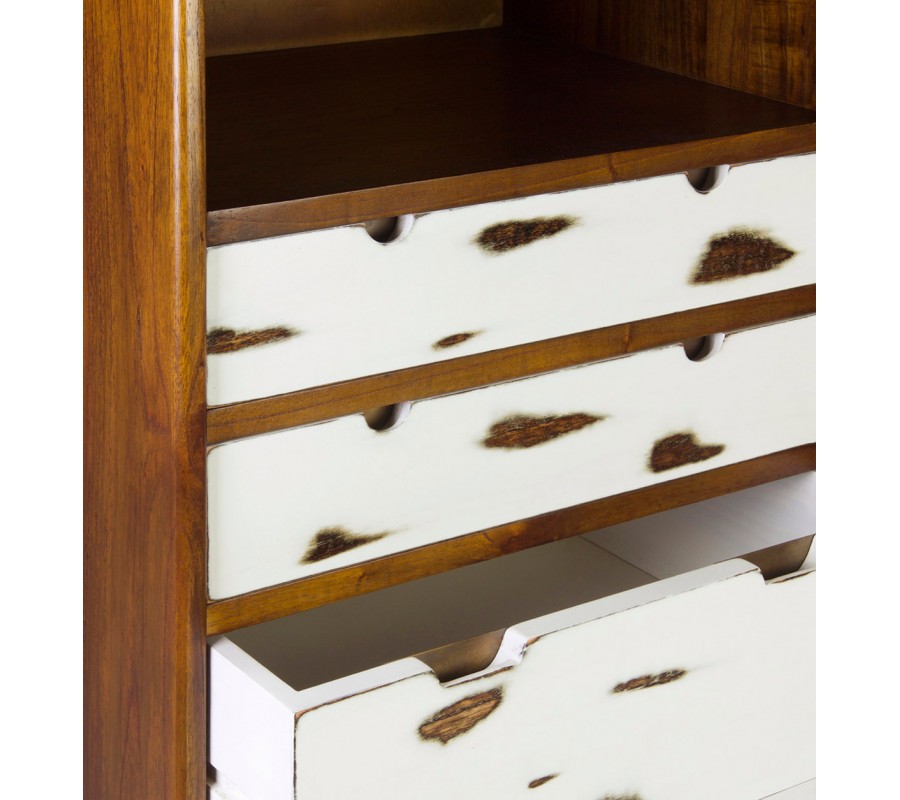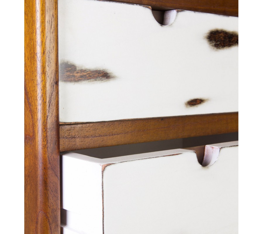 Zásuvky majú bielu farbu a ich náter je na prednej strane miestami zošúchaný, čo pôsobí pôvabným vintage dojmom. Zvyšné časti nábytku majú hnedú farbu dreva mindi, ktoré je charakteristické vysokým leskom. V kombinácii s teplými podtónmi pôsobí zlatistým dojmom a nábytku dodáva luxusný vzhľad.