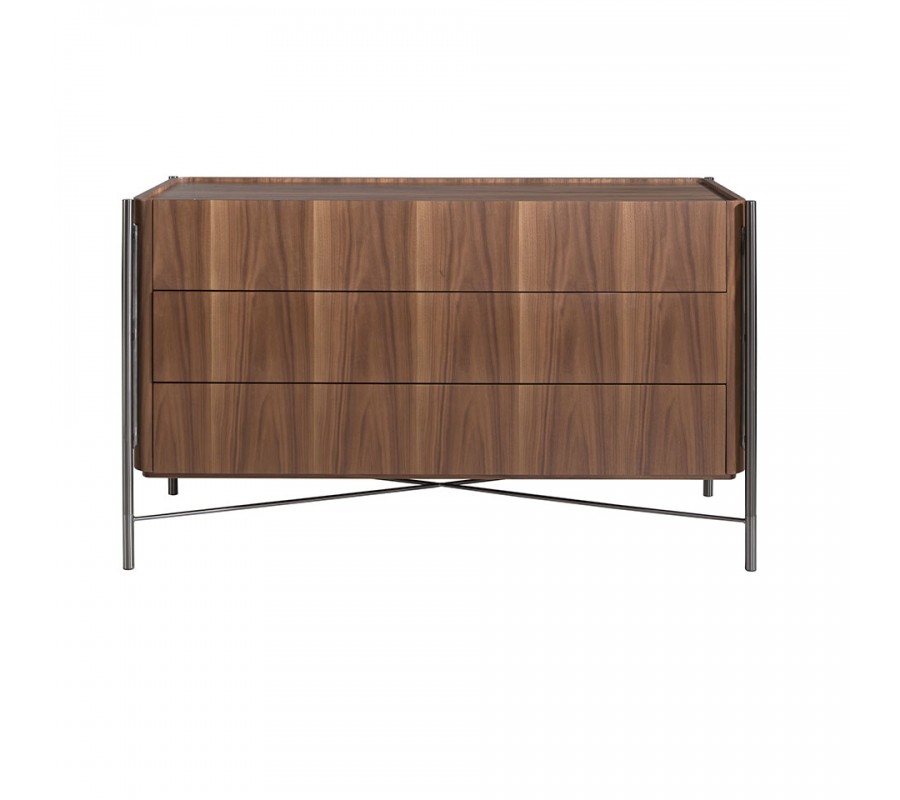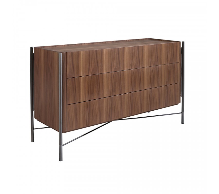 Luxusná moderná komoda Vita Naturale s tromi širokými zásuvkami z hnedého orechového dreva s tmavou kovovou konštrukciou 140 cm