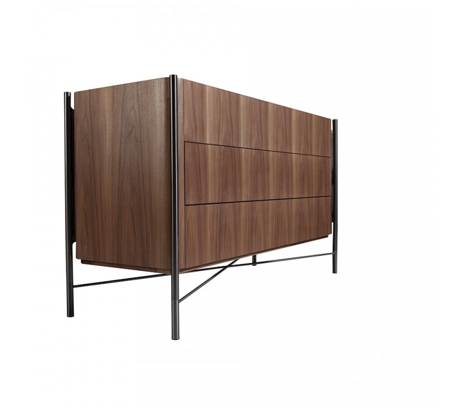 Konštrukcia z nehrdzavejúcej ocele v čiernej farbe prináša do dizajnu jemný nádych industriálneho štýlu. Tvoria ju štyri štíhle nožičky, ktoré sa tiahnu po celej výške komody. Sú pripojené k bočný hranám a ich valcovitý tvar korešponduje s jemne zaoblenými rohmi vrchnej dosky. Výbornú stabilitu poskytuje krížová spojnica v spodnej časti. Jedinečná štíhla kovová konštrukcia je funkčná a zároveň poskytuje estetický kontrast k mohutnej úložnej časti. Pôsobí ako ležérny dekoračný prvok, ktorý výborne zapadá do minimalistického štýlu.