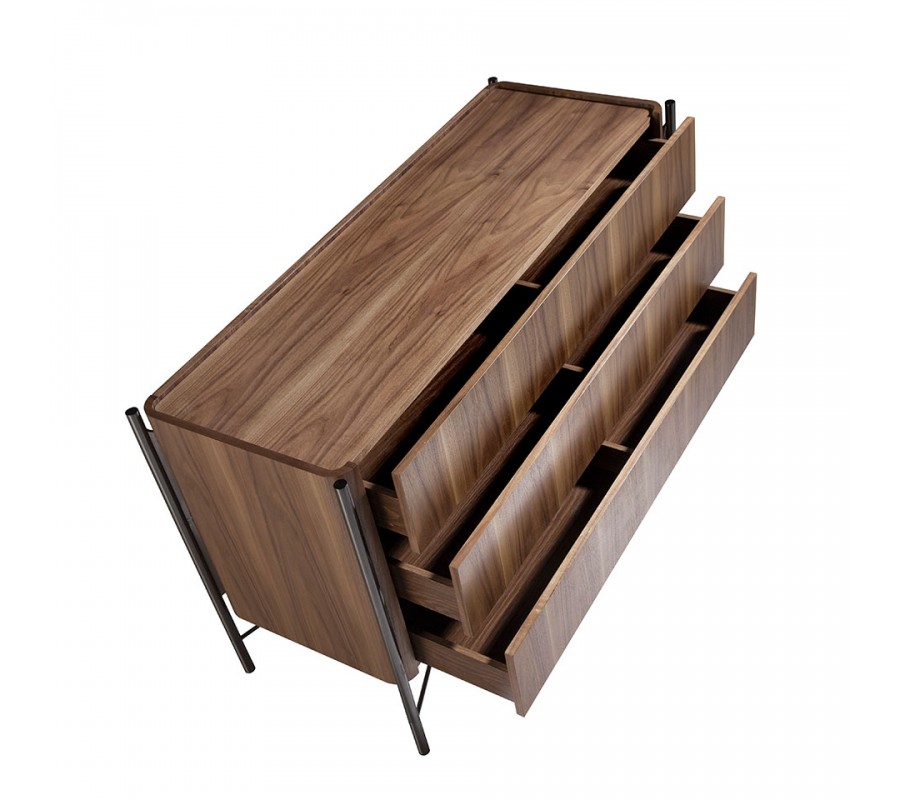 Komoda je vyrobená z pravej orechovej dyhy v elegantnej tmavej hnedej farbe. Úložný priestor tvoria tri široké, nad sebou umiestnené zásuvky. Každá je vnútri predelená priečkou na polovicu a sú tiež vybavené soft close systémom pre jemné zatváranie. Vyhotovenie bez úchytiek zdôrazňuje čistý moderný dizajn. Hladké povrchy nábytku zdobí kresba letokruhov dreva, organizovaná do vertikálnych línií. Vyzdvihuje prírodný materiál a komoda tak vnesie do miestnosti teplo pôsobiaci naturálny prvok.