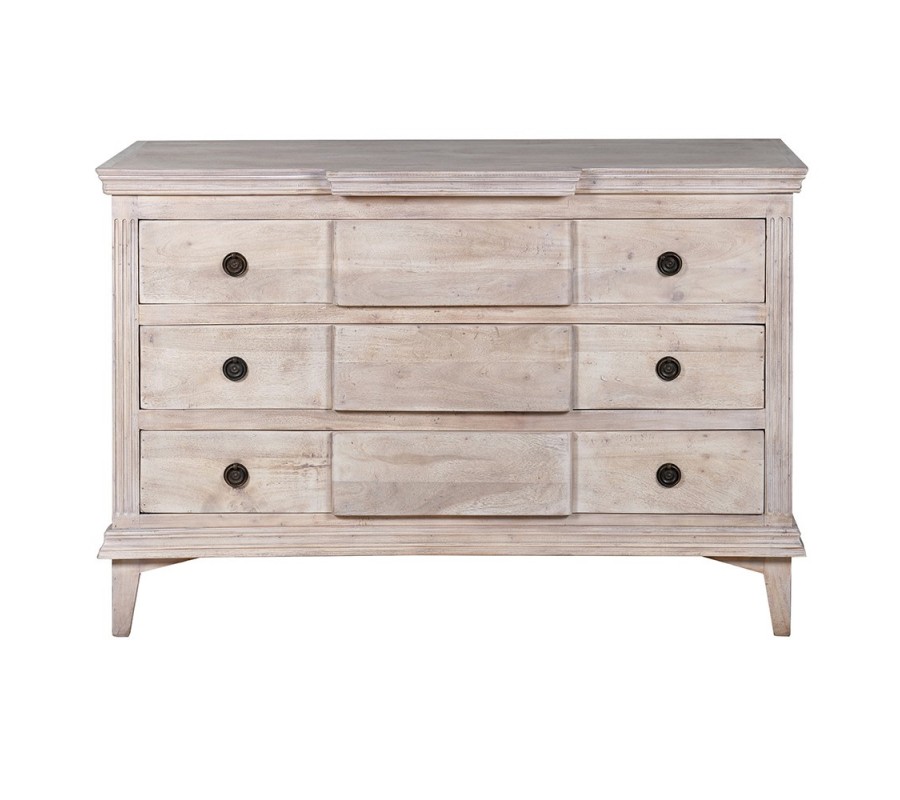 Komoda Nature prinesie do vašej spálne vidiecky šarm a originálny vintage charakter. Vďaka povrchovej úprave masívneho dreva pôsobí starožitným dojmom a reliéfne zdobenie dodáva nábytku klasickú eleganciu. Oceníte aj bohatý úložný priestor v troch širokých zásuvkách.