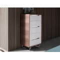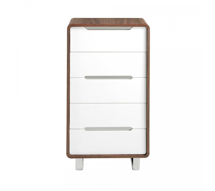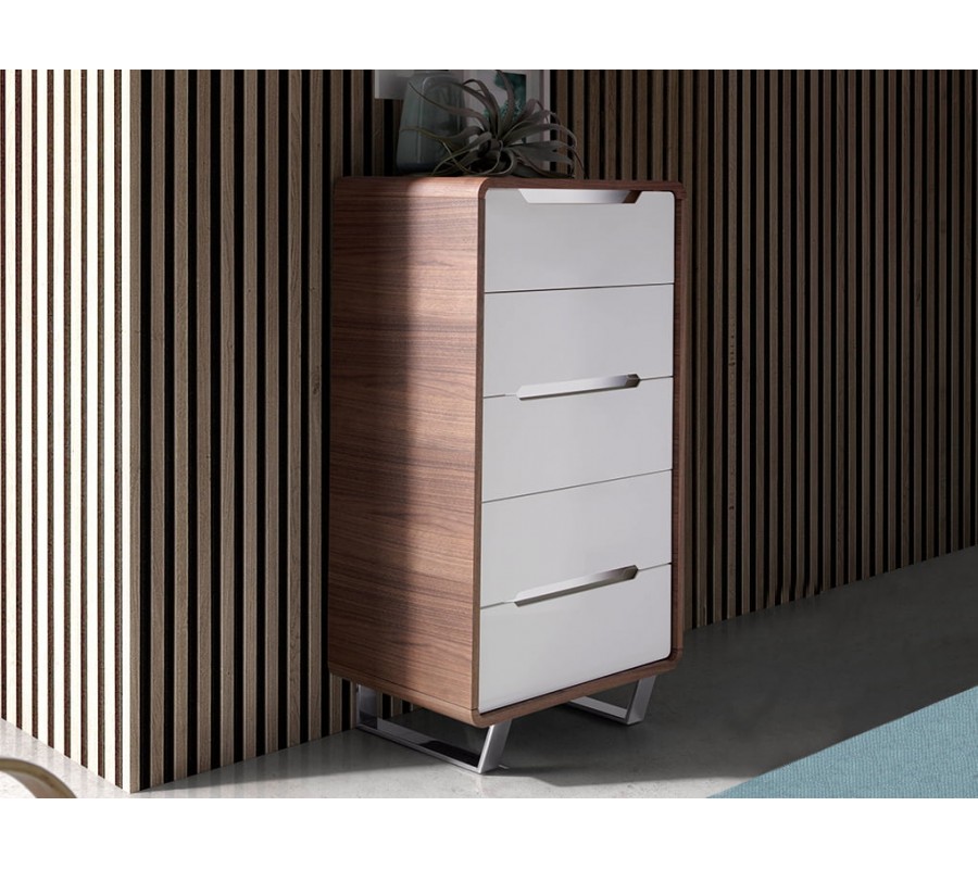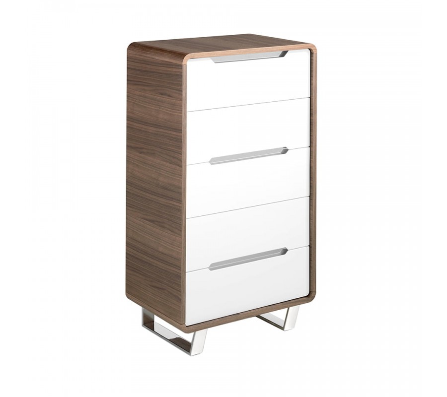 Komoda je vyrobená z dyhovaného orechového dreva. Rám má naturálnu svetlú hnedú farbu, popretkávanú tmavou kresbou letokruhov. Dyha umožňuje precíznu organizáciu prírodného materiálu do sofistikovaných vzorov, čoho výsledkom je naturálne pôsobiaci horizontálny vzor na bočných stranách komody. Akcentový prvok prináša do kompozície päť nad sebou umiestnených zásuviek v bielej farbe. Svetlý lesklý povrch pôsobí elegantným dojmom a v kontrastnej estetike pozdvihuje krásu dreva. Moderným dotykom sú lesklé chrómované úchytky a nožičky v tvare U.