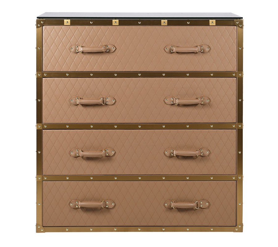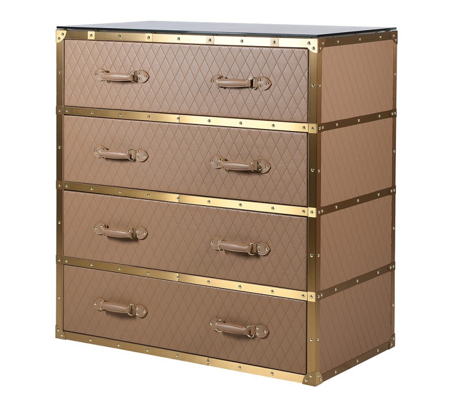Komodu lemujú výrazné zlaté pláty z nehrdzavejúcej ocele v štýle glamour, ktoré zvýrazňujú jej hranatú konštrukciu. Kovové rohy, okraje a úchytky sú upevnené pomocou dekoratívnych nitov, tie okrem estetickej hodnoty zvyšujú aj pevnosť a trvácnosť konštrukcie.