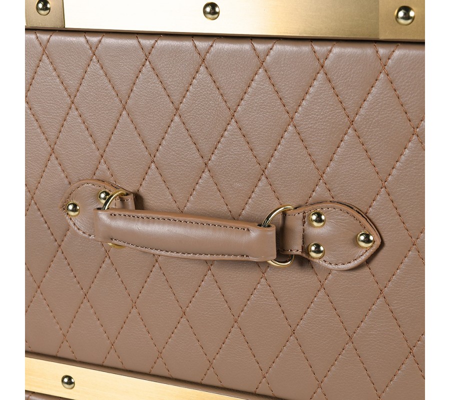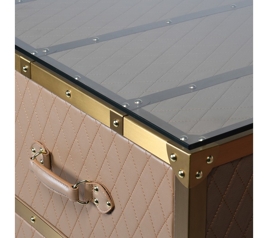 Povrch komody je pokrytý eko-kožou v teplom béžovom odtieni. Tento materiál je nielen estetický, ale aj odolný a ľahko udržiavateľný. Prešívaný vzor v tvare kosoštvorcov dodáva komode nádych luxusu a vytvára textúrovaný vzhľad. Zlaté detaily zvýrazňujú jej eleganciu a vytvárajú harmonický kontrast k béžovému čalúneniu. Vrchná časť je osadená elegantným bezpečnostným sklom, čo vytvára hladký, lesklý povrch, ideálny na vystavenie dekorácií, svietnikov alebo vázy.