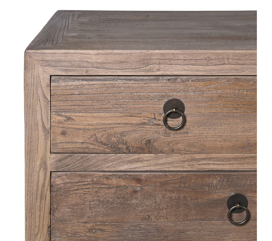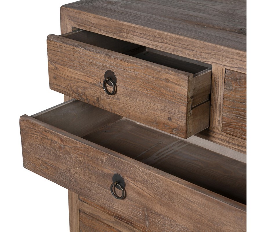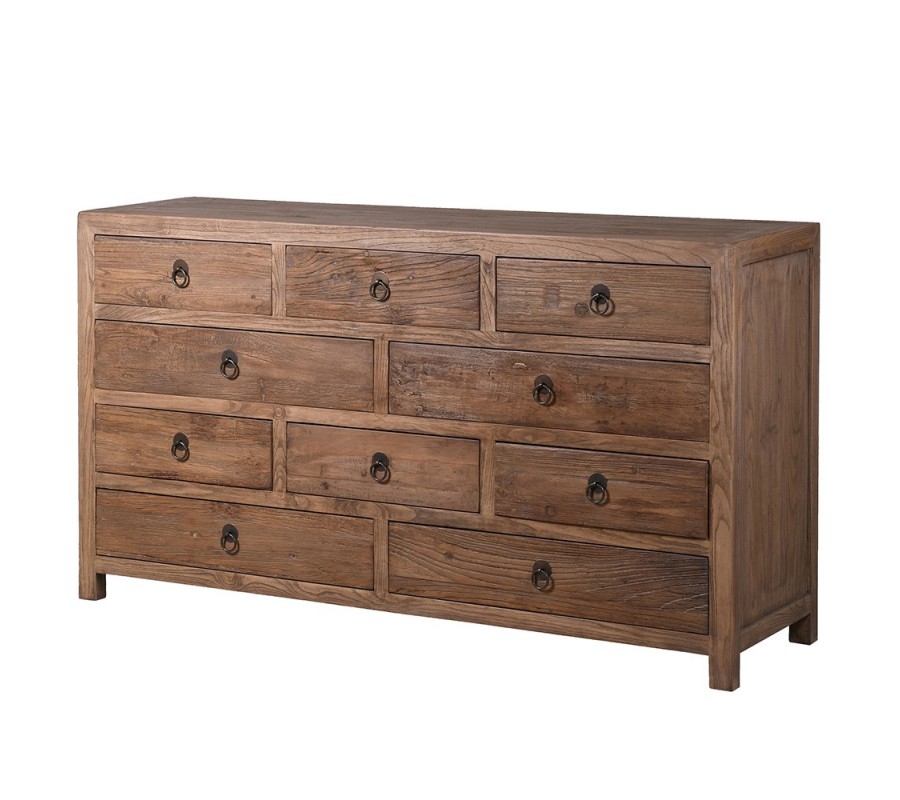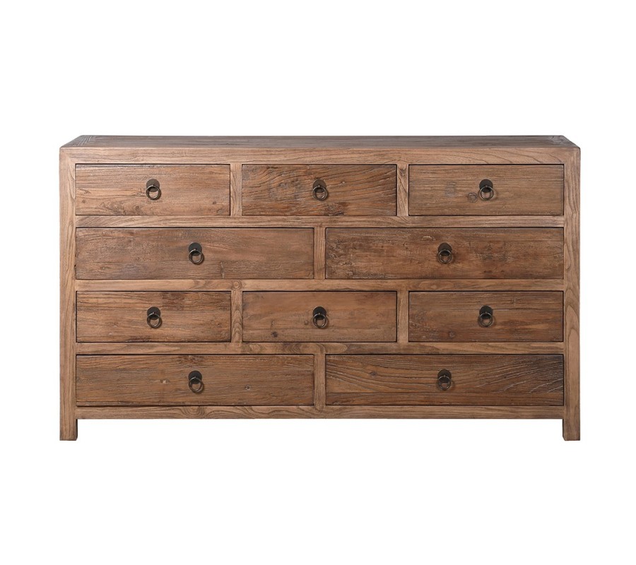 Rustikálna komoda Linda má obdĺžnikový tvar so zaoblenými hranami, vyrobená z masívneho brestového dreva. Povrch má prírodnu textúru, ktorá zvýrazňuje drevené zrno, a povrchová úprava je v teplom hnedo-orechovom odtieni. Komoda obsahuje celkovo 10 zásuviek, rozdelených do viacerých veľkostí, čo poskytuje rôzne možnosti úložného priestoru. Zásuvky majú kovové úchytky v čiernej farbe s jednoduchým kruhovým dizajnom, ktoré dodávajú tradičný a zároveň elegantný vzhľad.