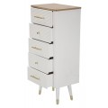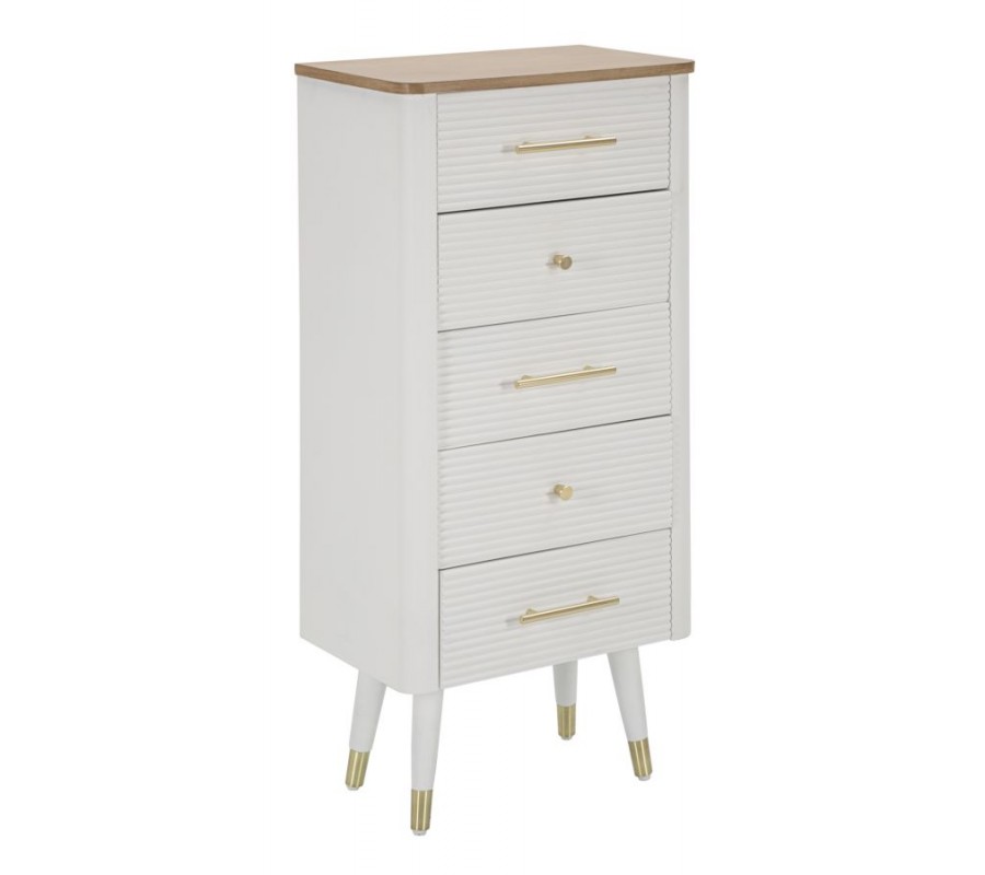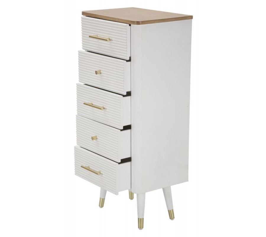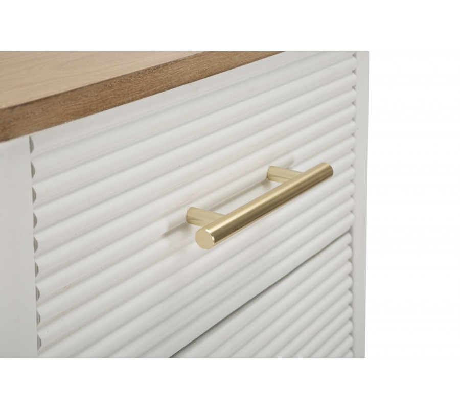 Art deco obdĺžniková biela komoda Samira s piatimi zásuvkami s vrúbkovaným povrchom a drevenou vrchnou hnedou doskou 100 cm