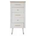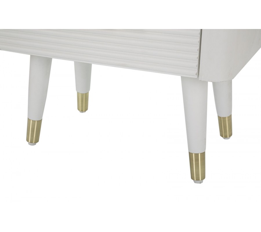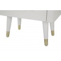 Stojí na štíhlych, mierne zošikmených nožičkách, ktoré dodávajú konštrukcii vzdušnosť a ľahkosť. Ich spodná časť je ozdobená zlatými kovovými detailmi, ktoré krásne ladia s úchytkami a dotvárajú luxusný vzhľad komody.