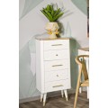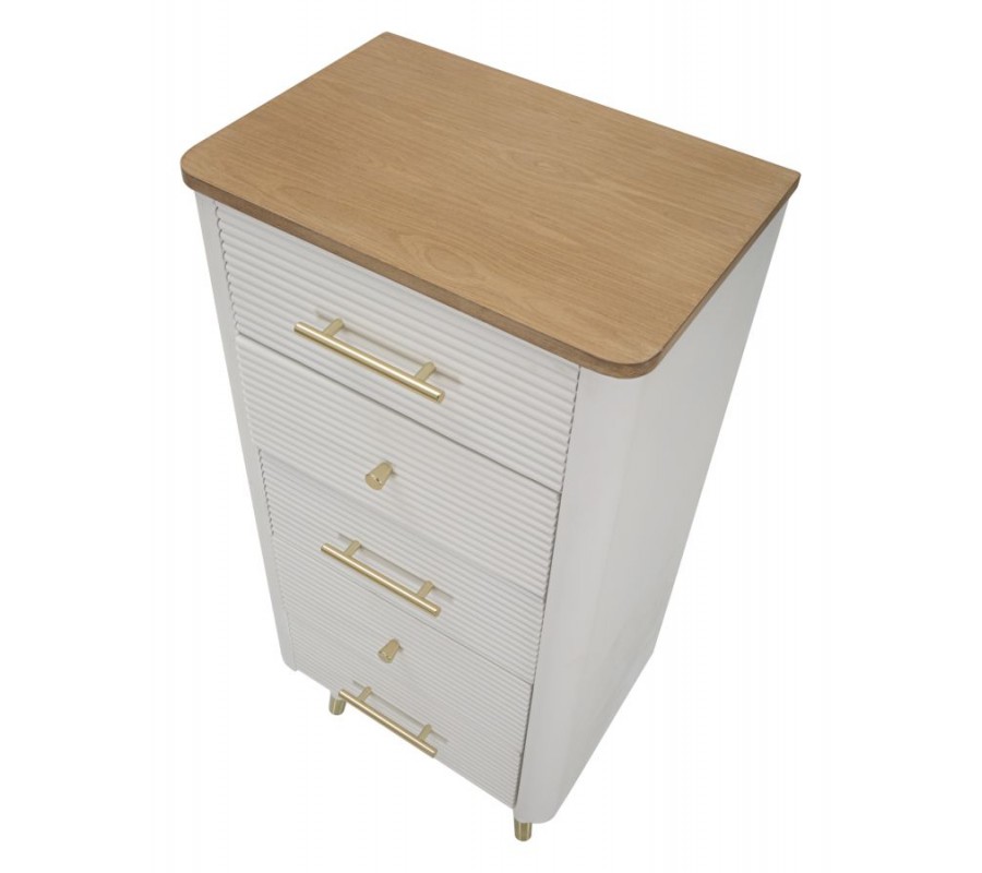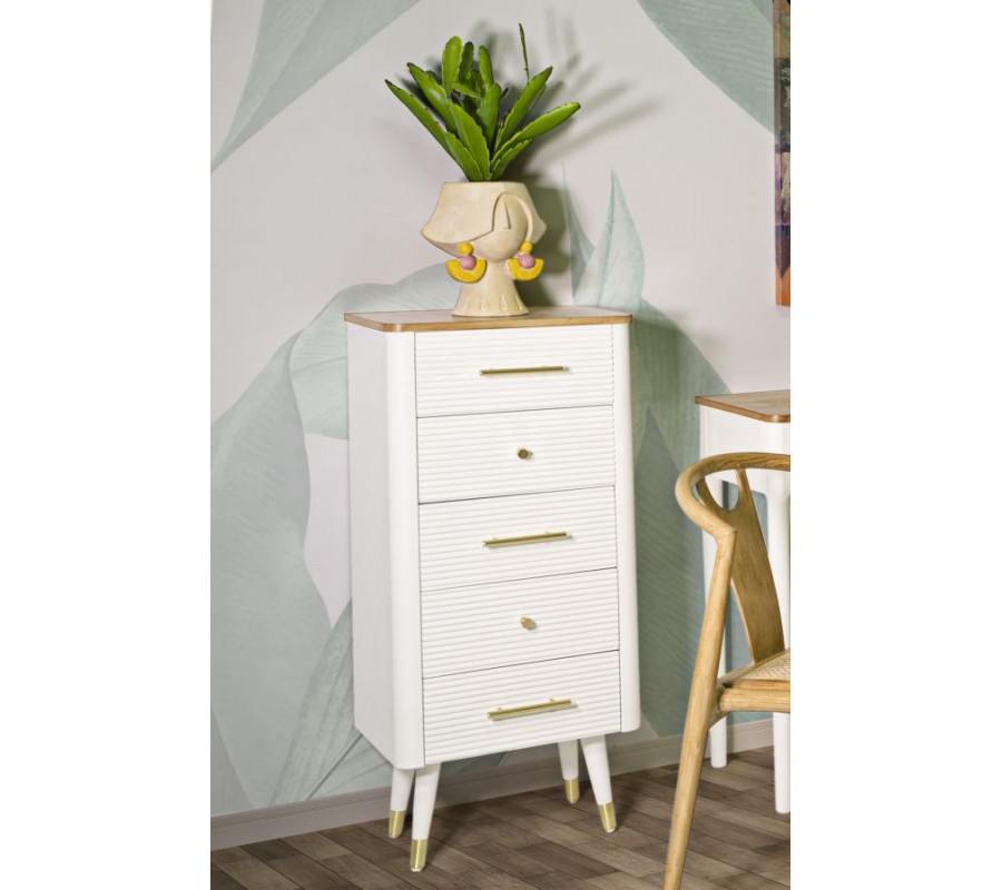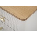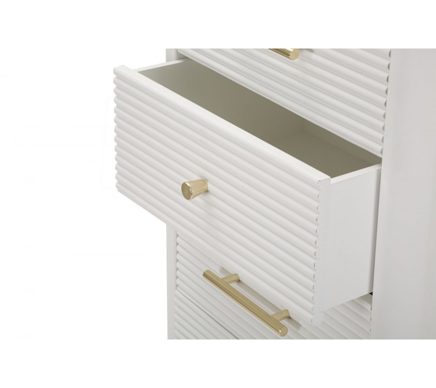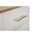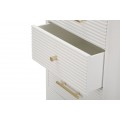 Štýlová komoda Samira v art deco a glamour štýle je elegantným a praktickým doplnkom do moderných interiérov. Vyrobená je z dreva v bielej farbe, ktorá jej dodáva ľahkosť a sofistikovaný vzhľad. Obdĺžnikový tvar a vrúbkovaný povrch na predných plochách zásuviek podčiarkujú jej dekoratívny charakter a dodávajú jej jedinečný vizuálny efekt.