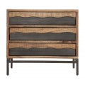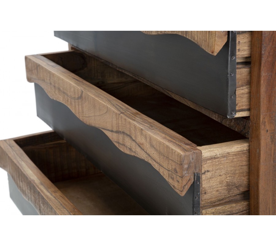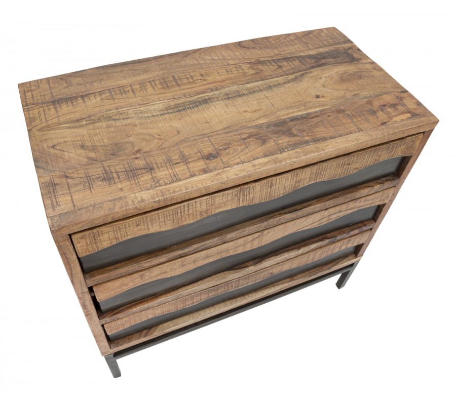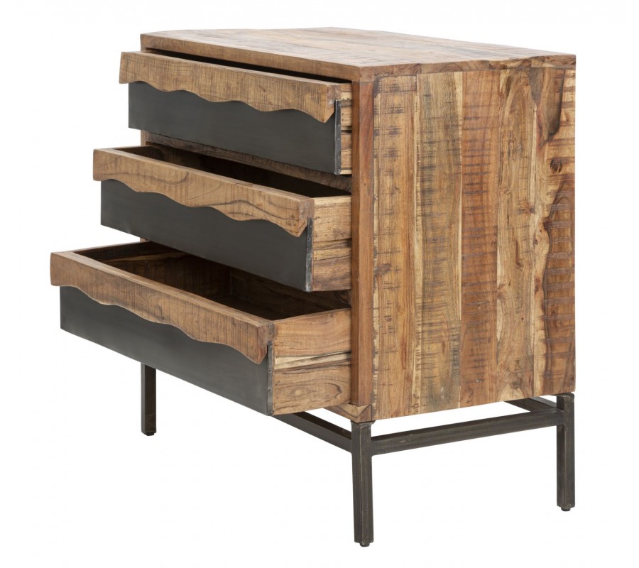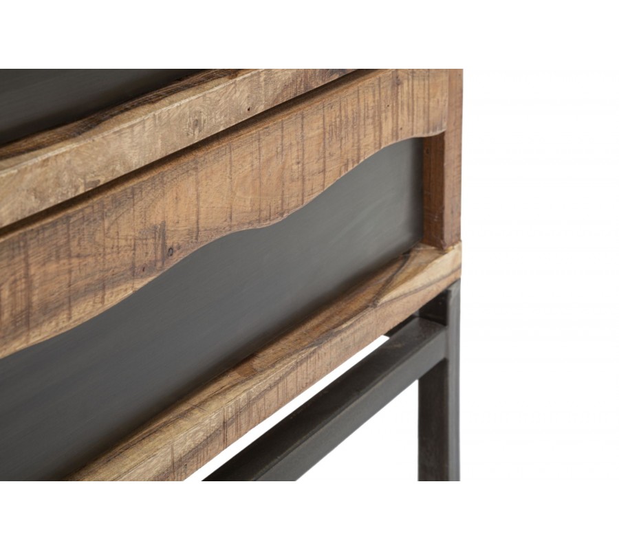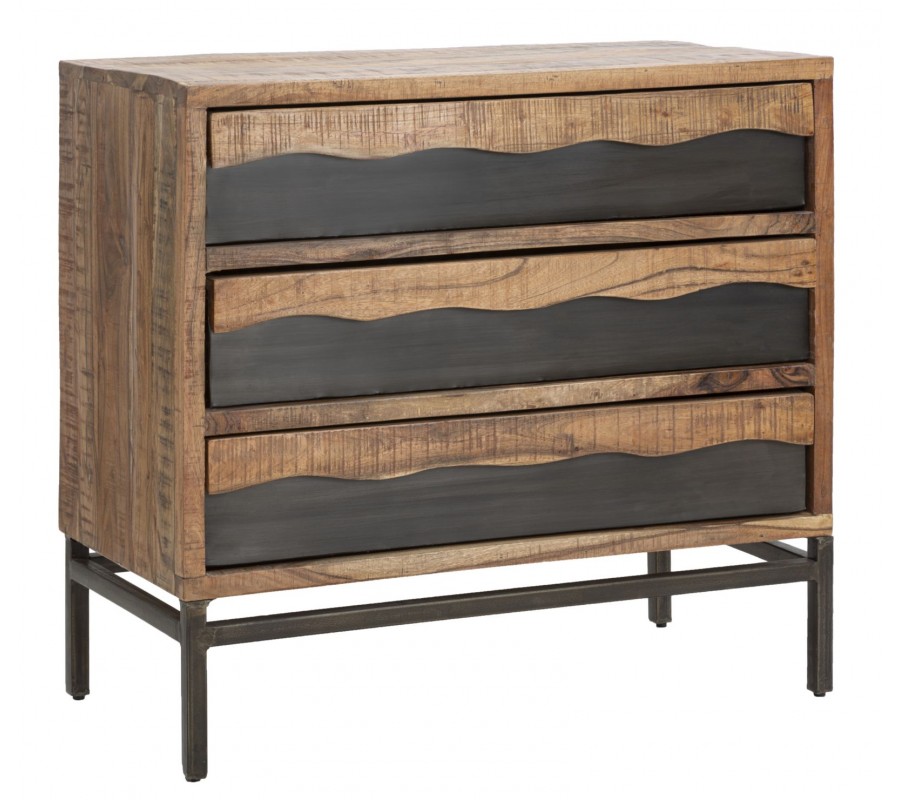 Industriálna komoda Berignone z masívneho akáciového dreva zaujme svojím obdĺžnikovým tvarom a originálnym dizajnom troch zásuviek. Spodná vrstva má ozdobný dizajn dreva s hladkým povrchom v tmavohnedej farbe, zatiaľ čo vrchná vrstva vyniká prírodným svetlejším odtieňom s vlnitými okrajmi a so zvýraznenou kresbou dreva, ktorá dodáva nábytku autentický charakter. Pevná kovová konštrukcia v lesklej hnedej farbe s hladkým povrchom a spojovacou tyčou vytvára industriálny vzhľad a zaisťuje stabilitu.