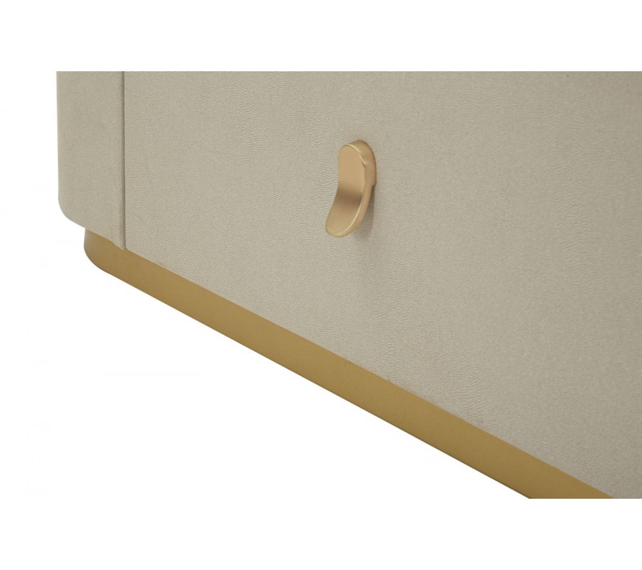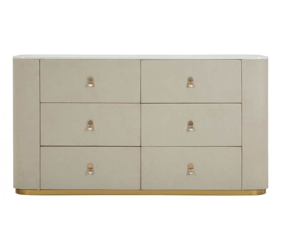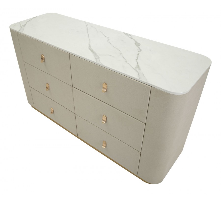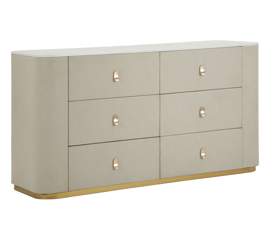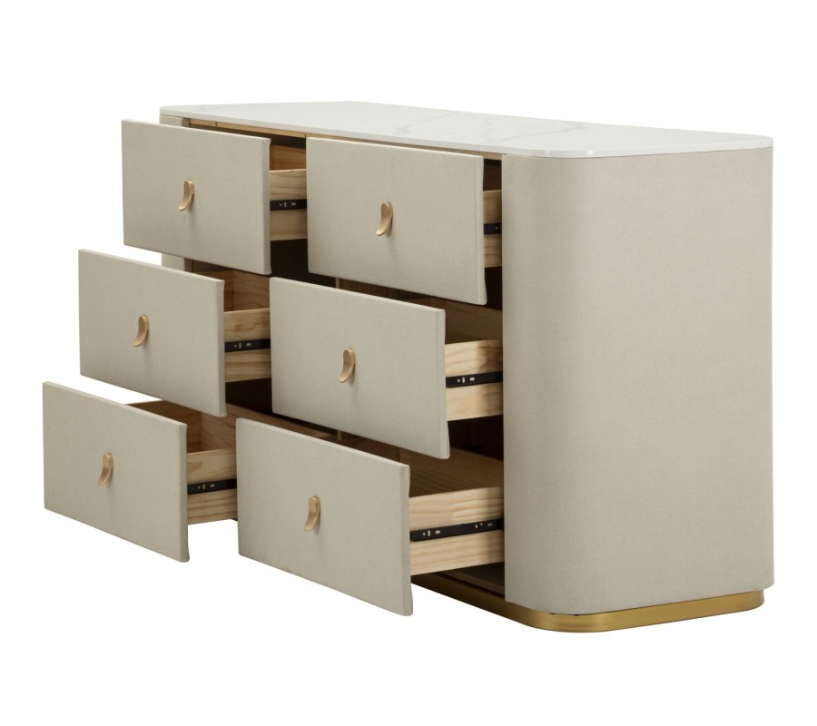 Dizajnová glamour béžová komoda Glamia Tapisé so šiestimi zásuvkami a poťahom so zlatým kovovým akcentom 140 cm