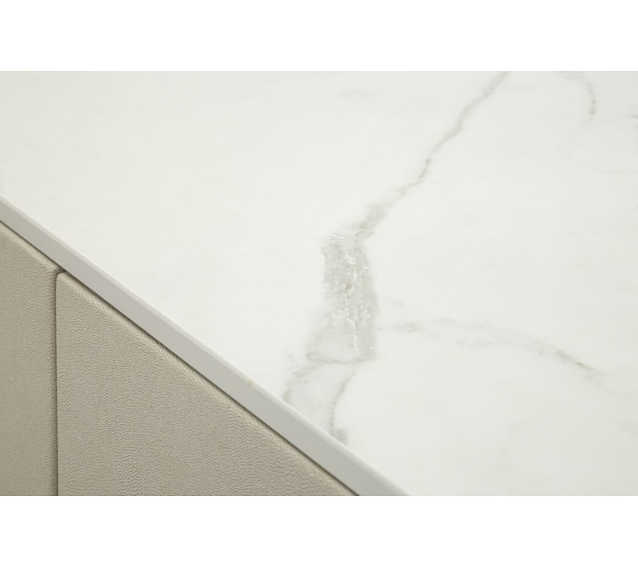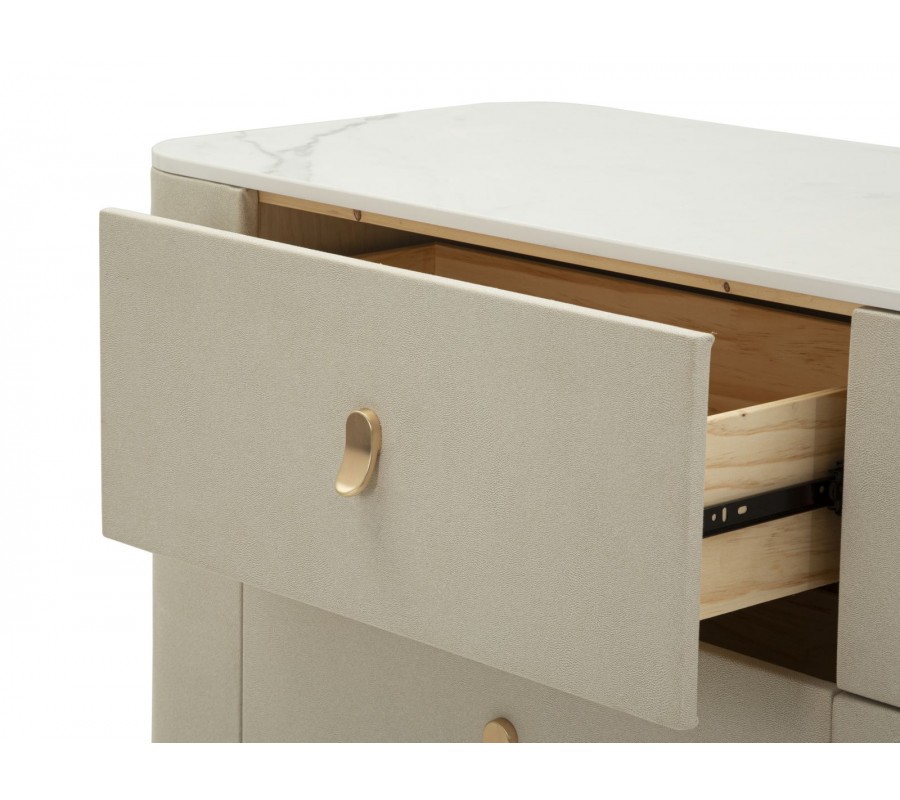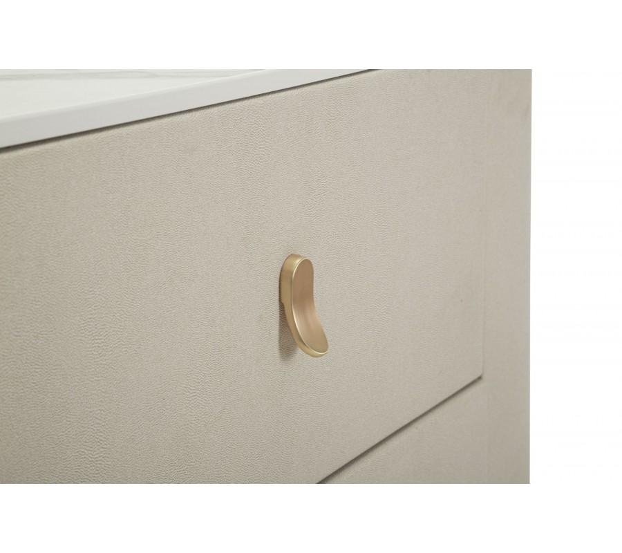 Komoda obsahuje uzavretý úložný priestor v podobe šiestich zásuviek, umiestnených v troch radoch. Každá zásuvka sa otvára pomocou oválnej úchytky z kovu v zlatej farbe. V rovnakom prevedení je vyrobená aj podstava nábytku a spoločne tvoria luxusný metalický akcentový prvok, ktorý výborne korešponduje s dizajnom bieleho mramoru na vrchnej doske.
