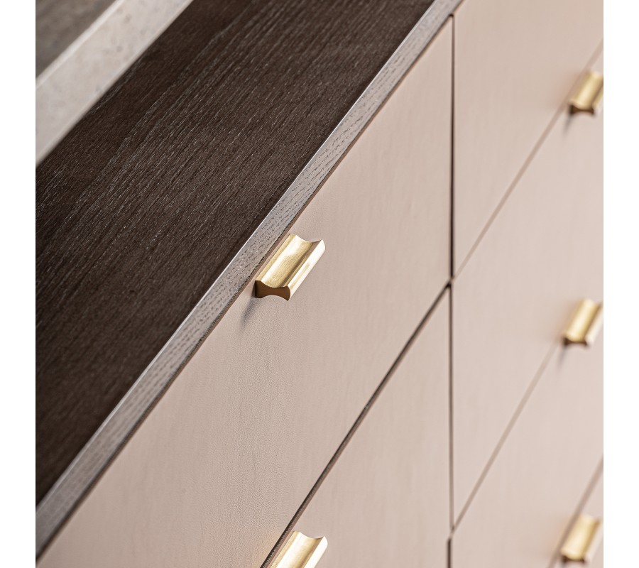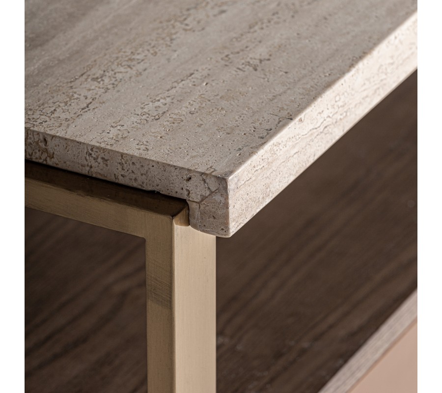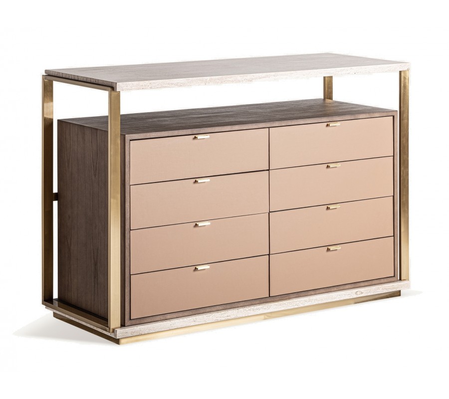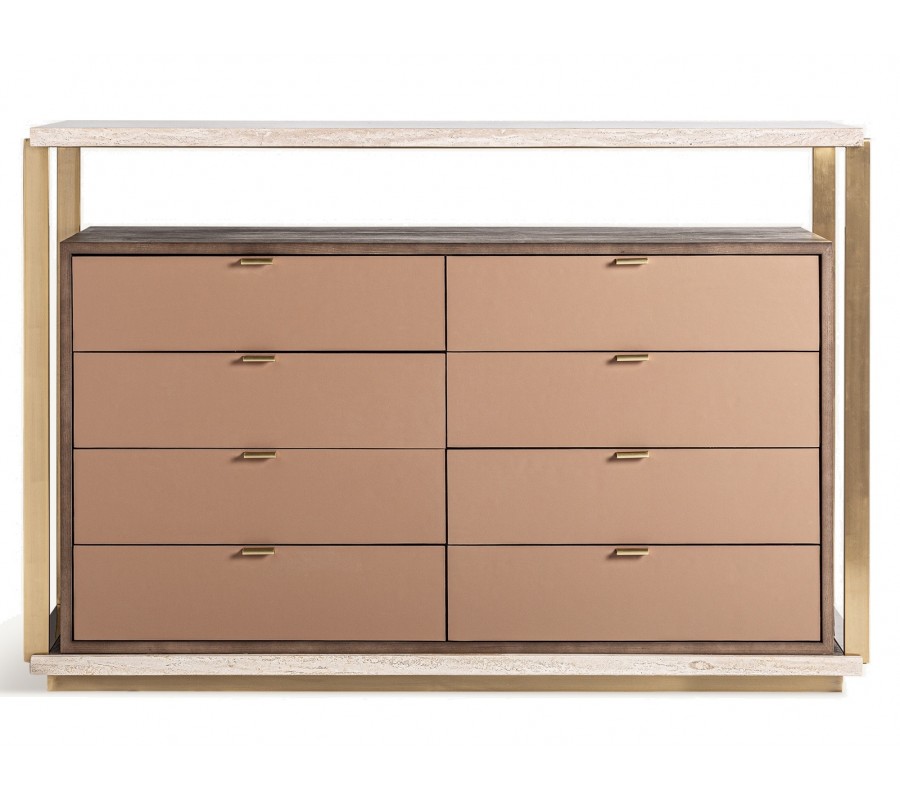 Konštrukciu rámujú dva bočné zlaté štvorcové kovové rámy, ktoré travertínové dosky spájajú do harmonického celku. Zadná spojovacia tyč zabezpečuje pevnosť a odolnosť celej štruktúry. Stredná časť komody je z masívneho dreva v hnedej farbe, s ôsmimi priestrannými zásuvkami s hladkým povrchom a poličkou, ktoré sú doplnené zlatými kovovými úchytkami. Korpus komody je vyrobený z MDF, čo zaručuje vysokú pevnosť a dlhú životnosť.
