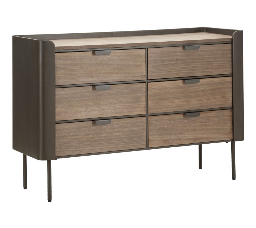 Industriálna obdĺžniková hnedá drevená komoda Lavient s kovovou konštrukciou so šiestimi zásuvkami a zaoblenými hranami 129 cm