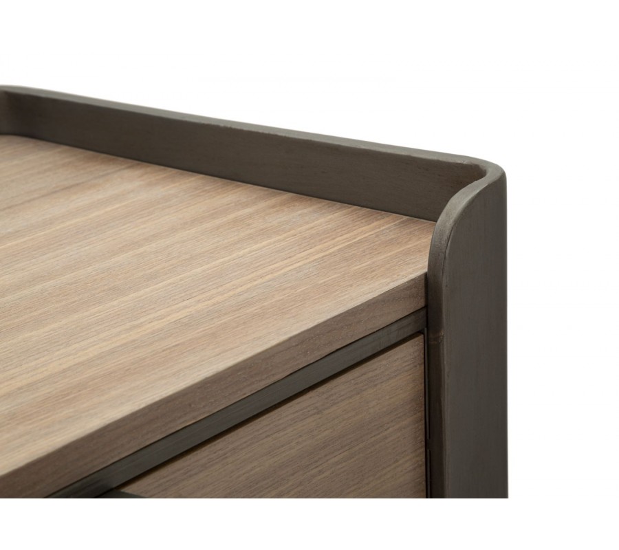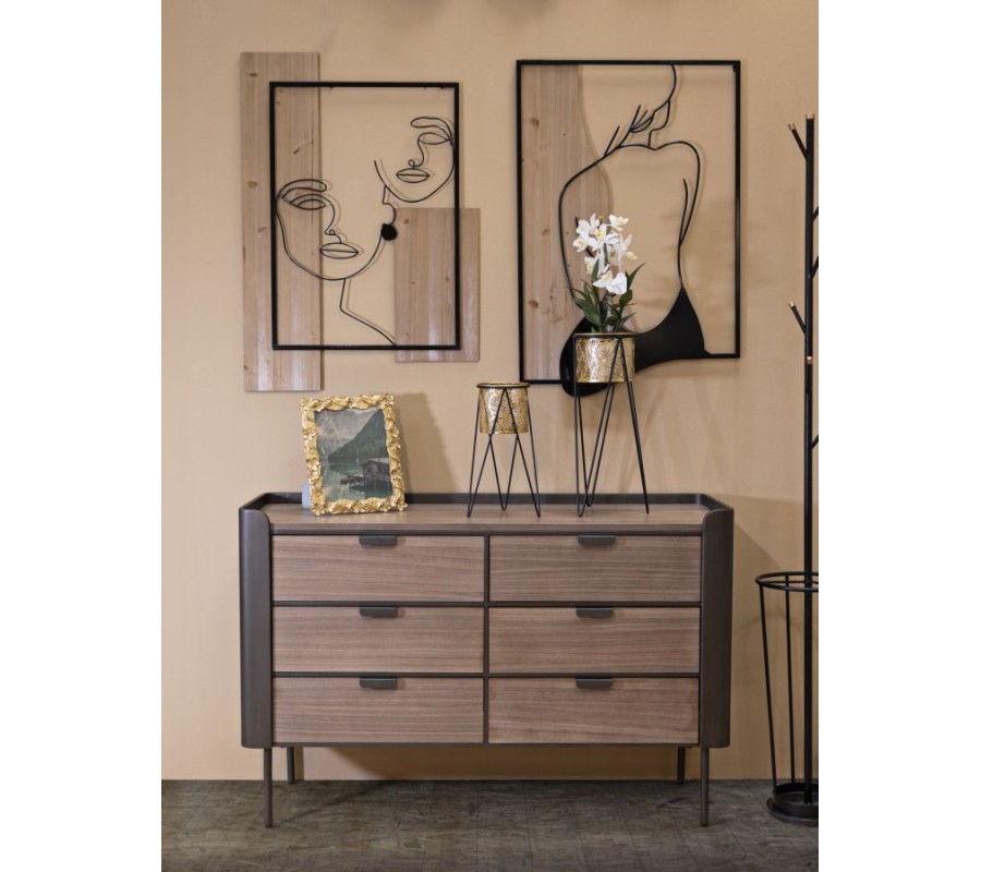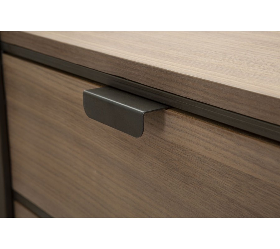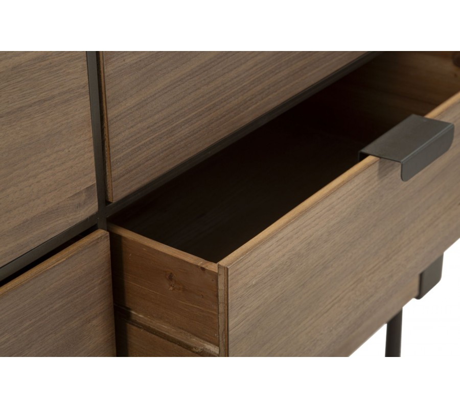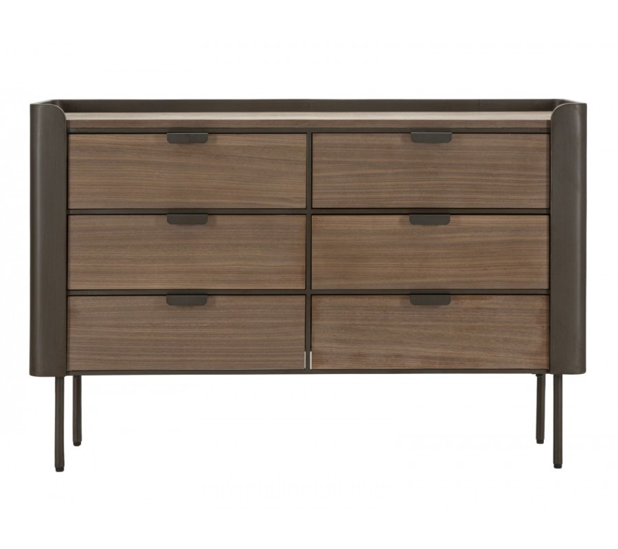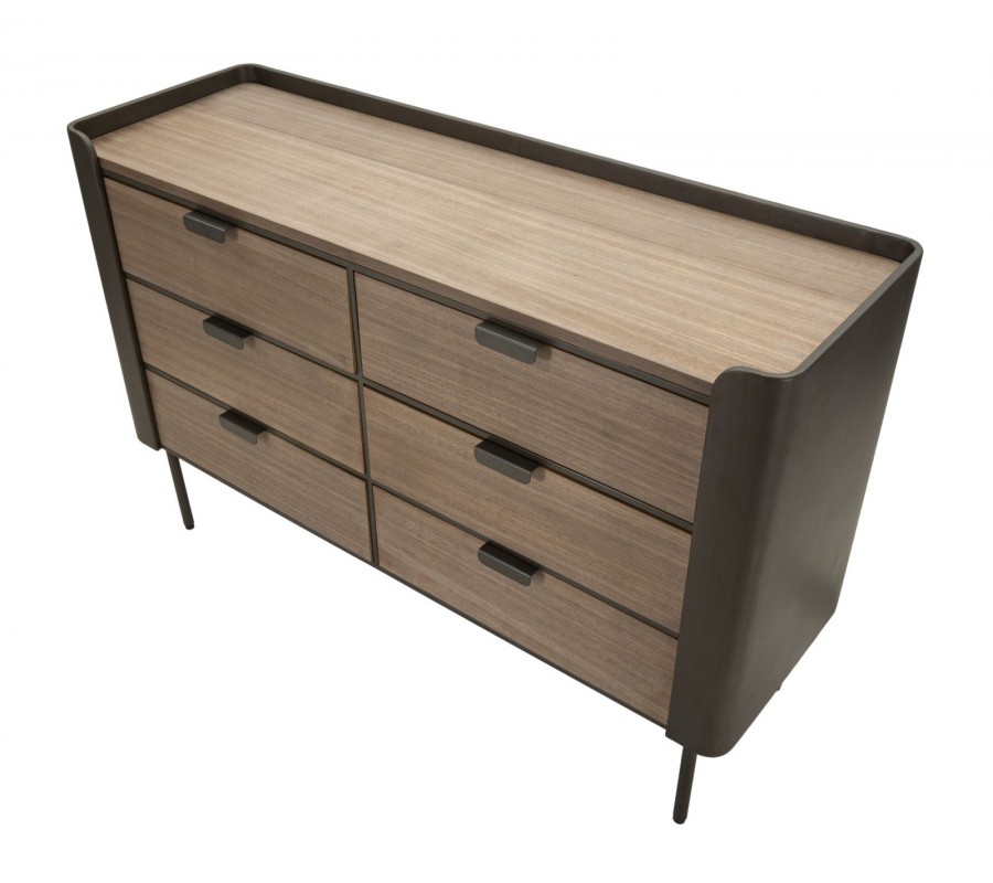 Komoda disponuje šiestimi priestrannými zásuvkami, ktoré sú opticky oddelené tenkými kovovými priečkami a doplnené o diskrétne zapustené kovové úchytky v tmavosivej farbe. Horná doska je lemovaná vyvýšeným okrajom, ktorý vytvára praktický aj estetický detail a zabraňuje zošmyknutiu predmetov.