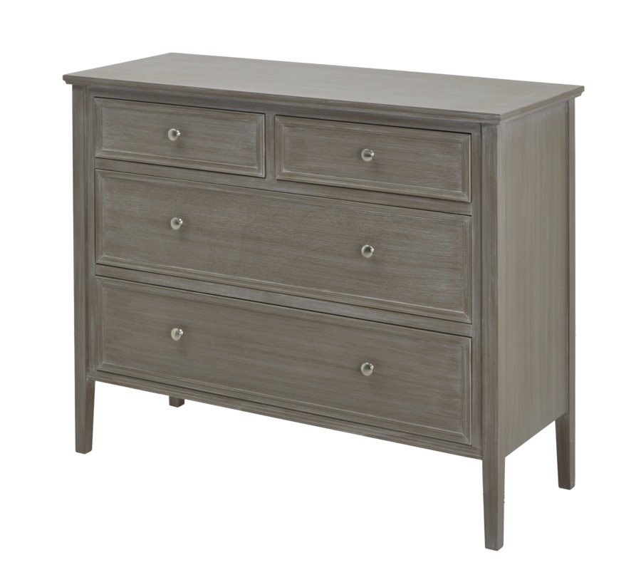 Luxusná sivá vidiecka obdĺžniková komoda Elmont z masívneho dreva so štyrmi zásuvkami a vysokými úzkymi nožičkami 110 cm