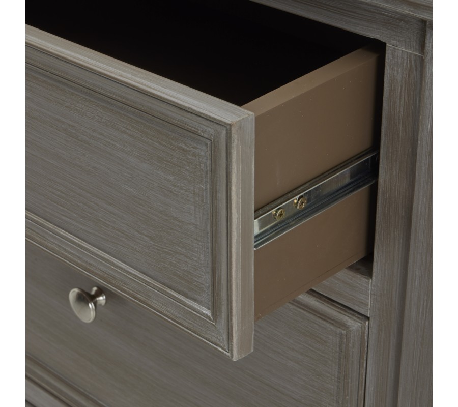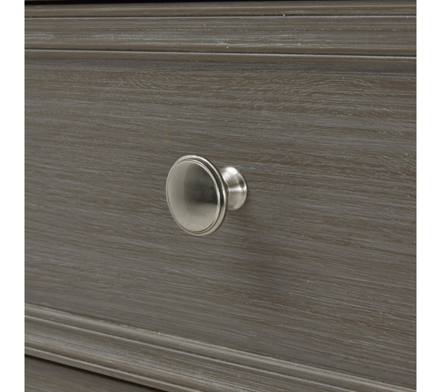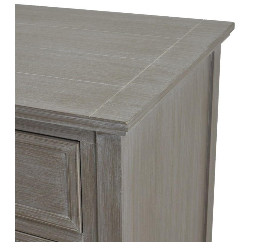 Vyrobená je z masívneho dreva s jemne sivou povrchovou úpravou, ktorá zvýrazňuje prirodzenú kresbu materiálu a dodáva komode svieži, ale zároveň nadčasový charakter. Každá zo štyroch zásuviek – dve menšie v hornej časti a dve širšie pod nimi – je osadená dvojicou okrúhlych kovových úchytiek, ktoré ladia s celkovým minimalistickým vzhľadom a zároveň uľahčujú manipuláciu.