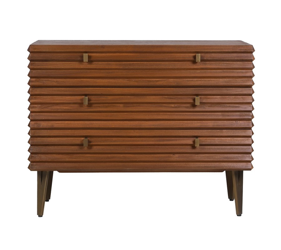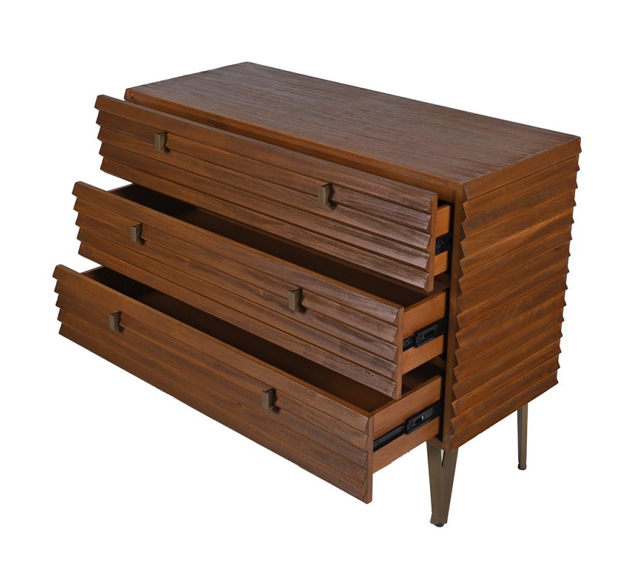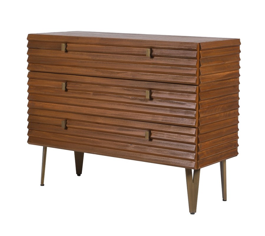 Luxusná retro masívna hnedá obdĺžniková komoda Striata s 3D lamelovým povrchom a tromi zásuvkami 108 cm