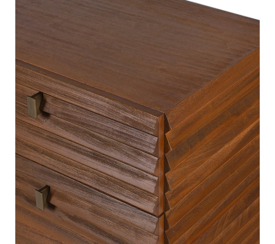 Luxusná komoda Striata v retro štýle zaujme na prvý pohľad svojím obdĺžnikovým tvarom a originálnym 3D lamelovým povrchom. Predná aj bočné strany sú zdobené štruktúrou pripomínajúcou fasádny obklad, kde jednotlivé trojuholníkové dosky vytvárajú dynamický efekt smerom nadol. Tento detail dodáva komode výraznú priestorovosť a vizuálnu hĺbku.