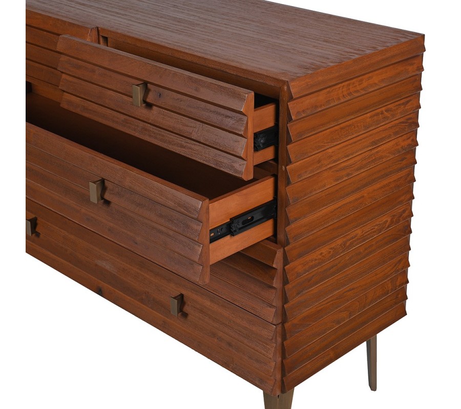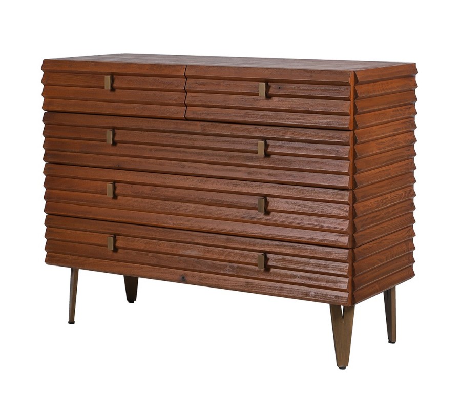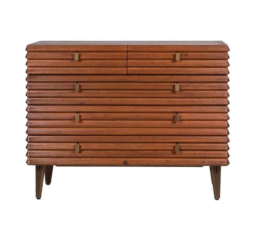 Luxusná retro obdĺžniková masívna komoda Striata z dreva lamelovým dizajnom v hnedej farbe s piatimi zásuvkami 111 cm