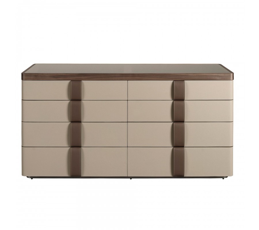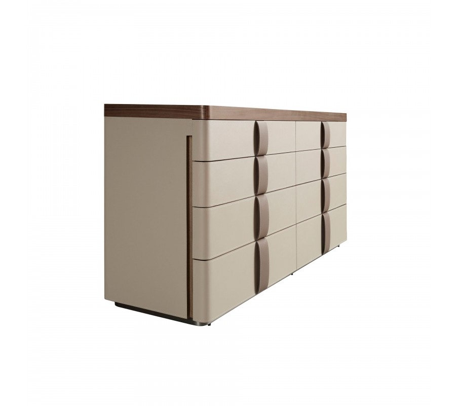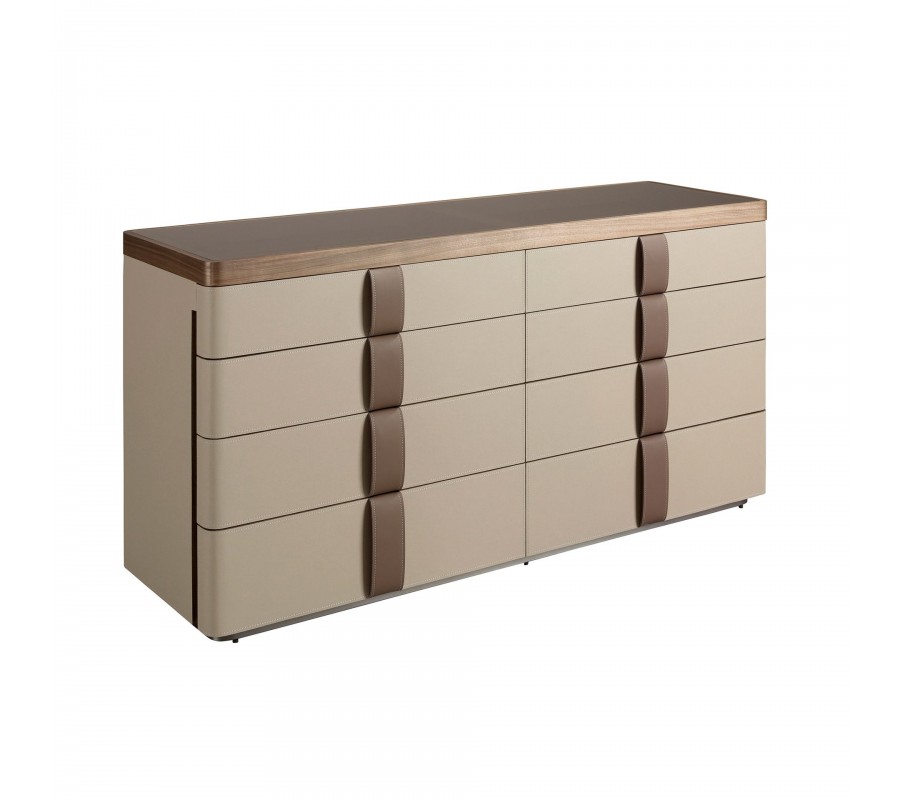 Komoda je vyrobená z kvalitného dyhovaného orechového dreva v naturálnej teplej hnedej farbe, viditeľnej na bočnej hrane vrchnej dosky a v interiéri zásuviek. Telo pokrýva poťah z kvalitnej pravej kože s hladkým finišom v svetlej béžovej farbe. Výborne ju dopĺňajú tiež kožené úchytky v čokoládovej hnedej farbe. Sú umiestnené vertikálne v strede každej zásuvky a vytvárajú dva kontrastné pásy, prechádzajúce fasádou nábytku.