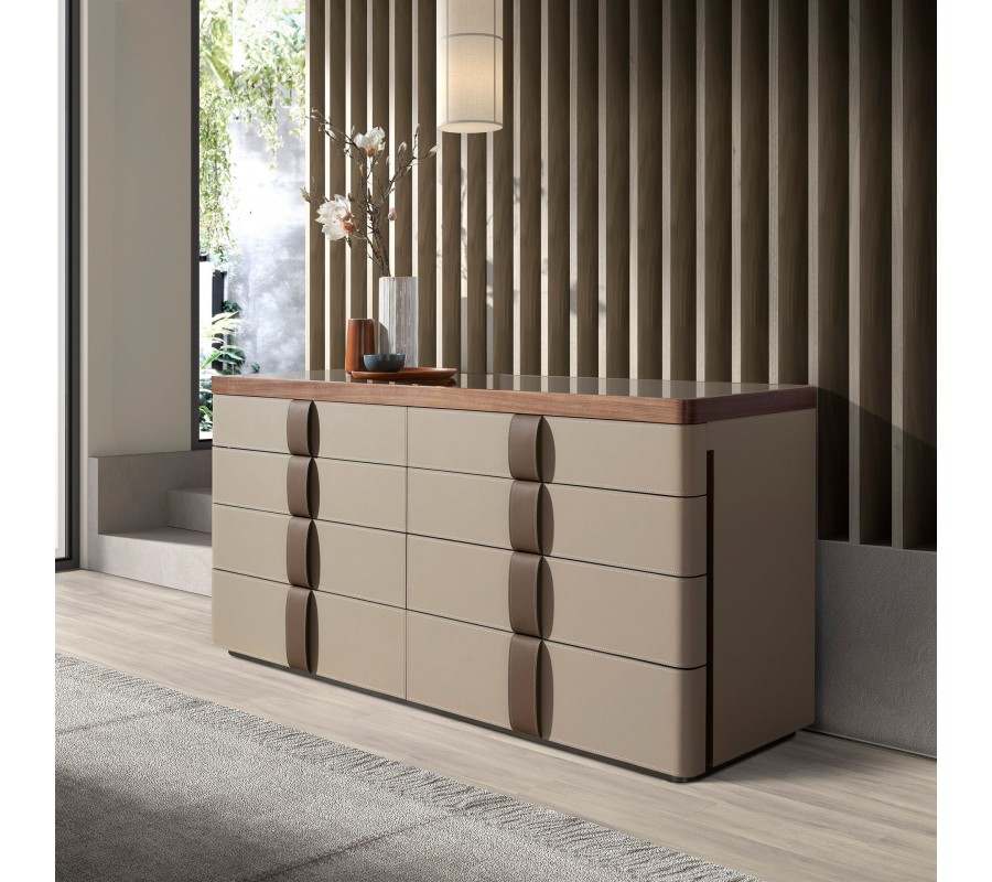Komoda Charmoin vás očarí svojím moderným talianskym dizajnom a exkluzívnou pravou kožou. Do spálne prinesie dotyk luxusu, zatiaľ čo paleta zemitých odtieňov pôsobí elegantným a sofistikovaným dojmom.