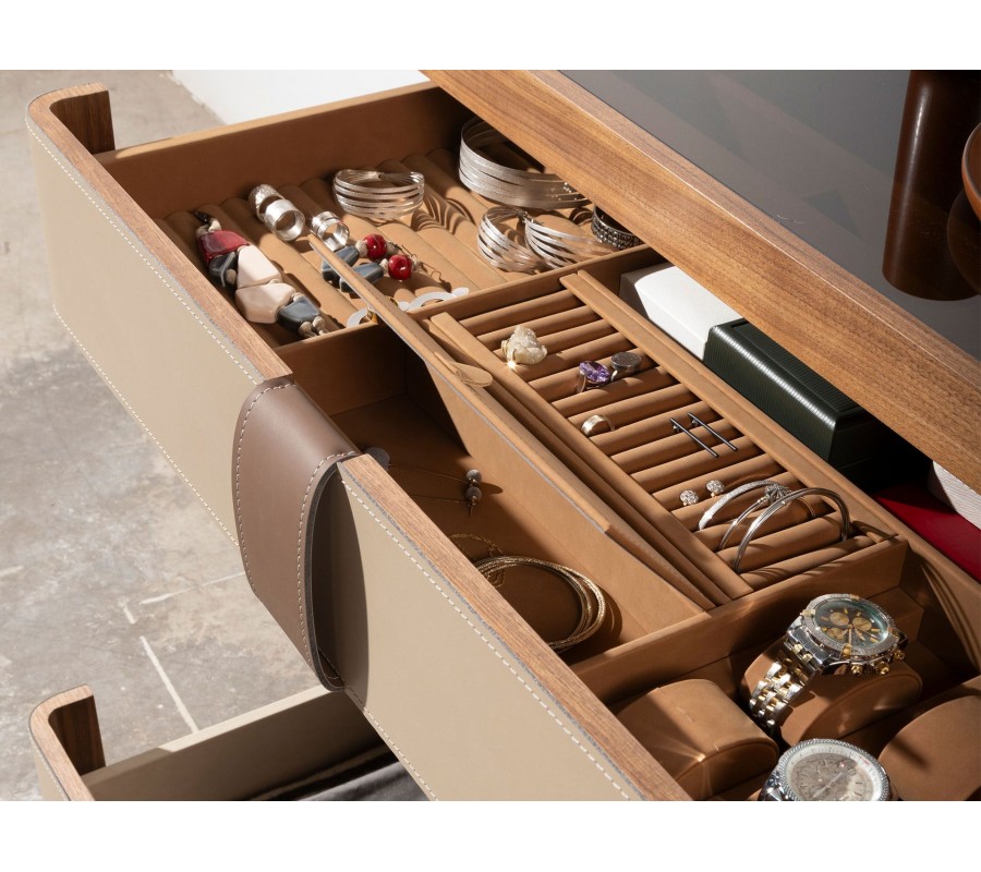 Komoda vám poskytuje bohatý úložný priestor v ôsmich zásuvkách, umiestnených v štyroch radoch. Spodný rad má výšku 17 cm, stredné dva 12 cm a najvyššie zásuvky 10 cm. Vrchné zásuvky sú predelené na menšie priečinky, ideálne na organizované uskladnenie šperkov či doplnkov. Výborne ich dopĺňa priehľadná vrchná doska z tónovaného hnedého skla.