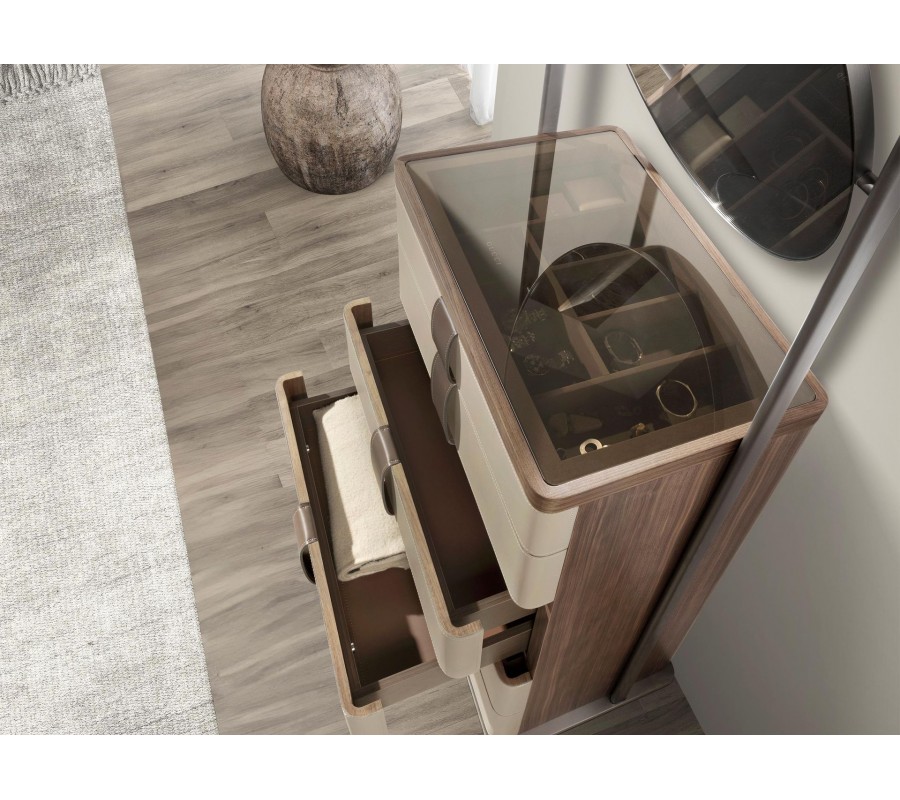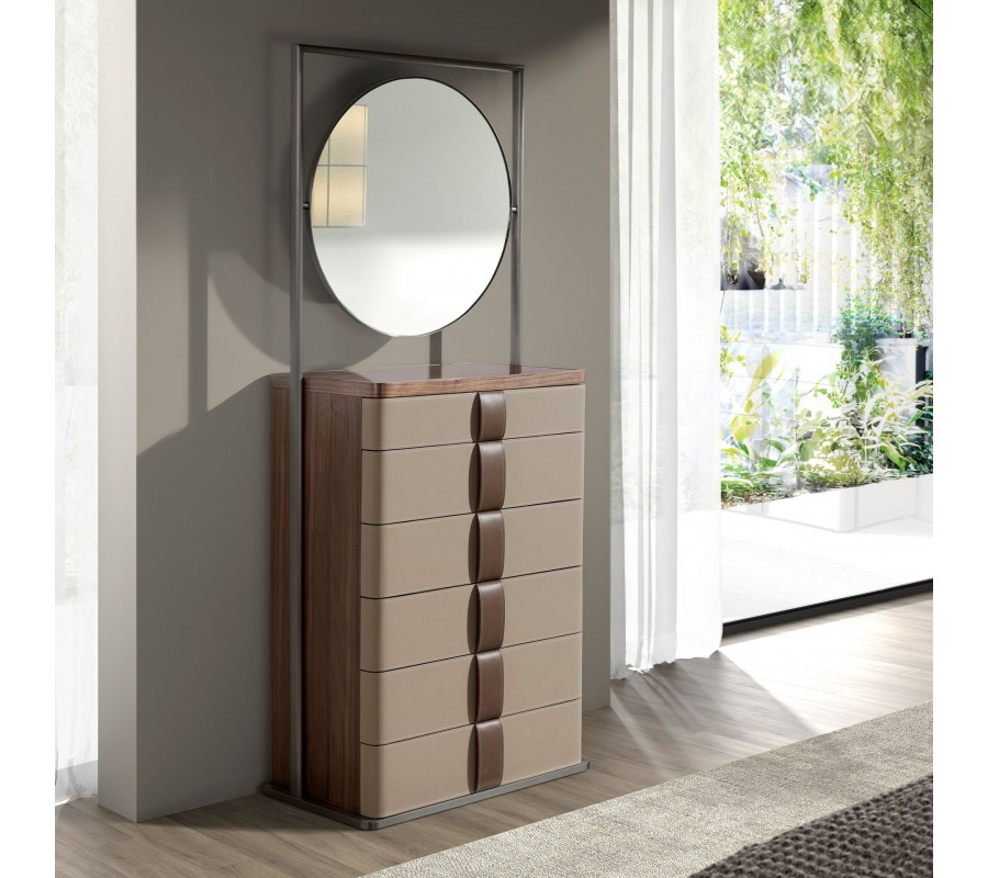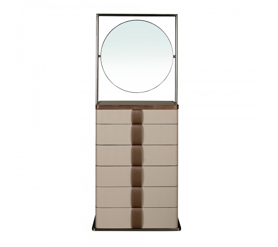 Komoda so zrkadlom Charmoin pôsobí vďaka spojeniu geometrických línií a zemitých odtieňov čistým moderným dojmom. Je ideálnou voľbou pre tých, ktorá chcú dodať svojej spálni dotyk tichého luxusu. Môžete ju doplniť ďalším exkluzívnym talianskym dizajnovým nábytkom z našej ponuky.