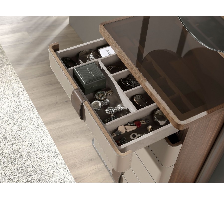Čelá zásuviek pokrýva poťah z kvalitnej pravej kože v norkovom béžovom odtieni. V strede každej zásuvky je umiestnená široká zvislá úchytka, taktiež z kože, ale v kontrastnej čokoládovej hnedej farbe. Okrem praktickej funkcie vytvárajú dizajnový vertikálny pás, plynúci stredom fasády nábytku po celej výške.